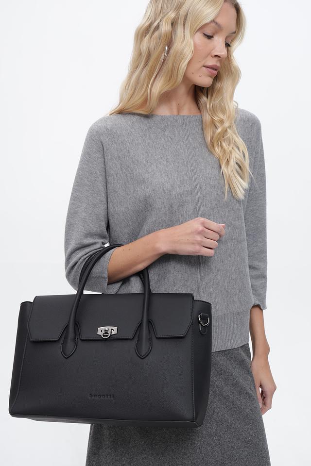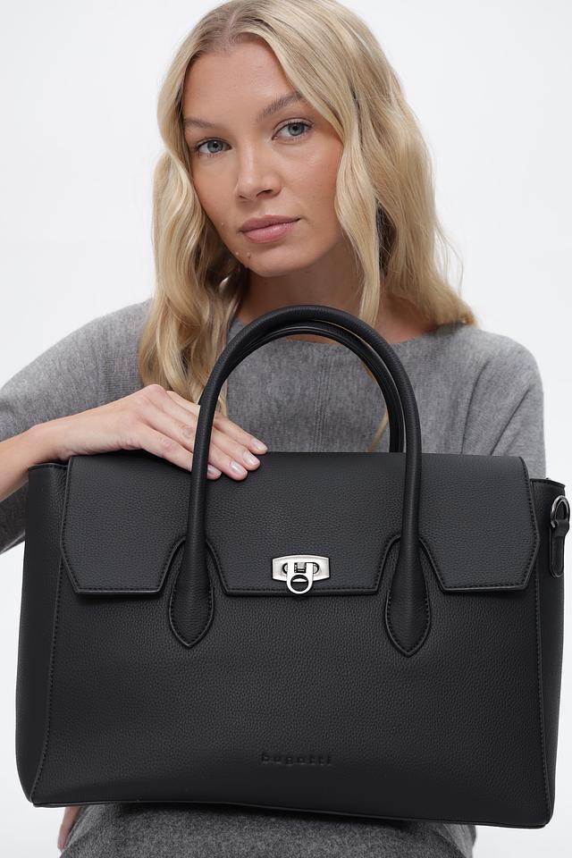 Женская сумка от Bugatti выполнена из высококачественного полиуретана в классическом чёрном цвете. Модель имеет прямоугольную форму с закругленными углами и аккуратными линиями.
