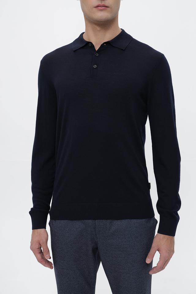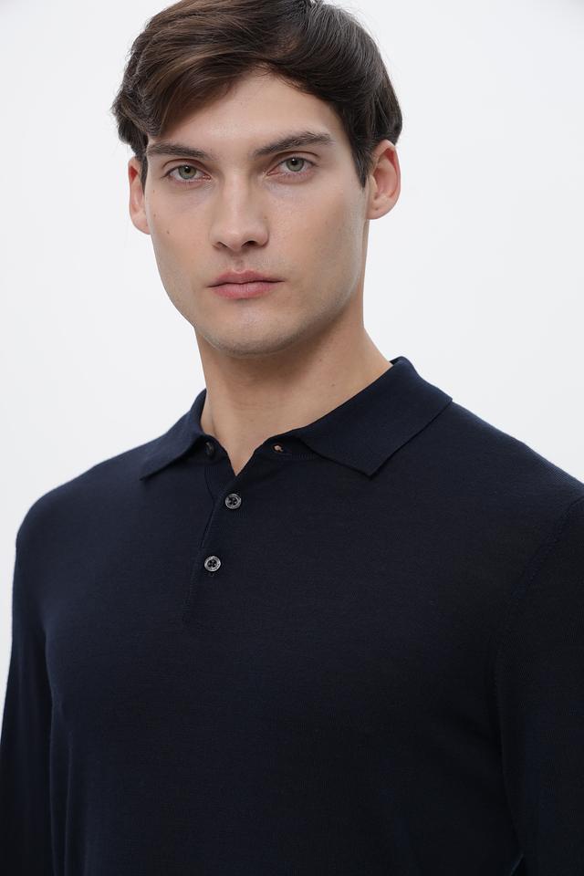 Джемпер имеет классический крой с длинными рукавами и воротником-поло с небольшой планкой, застегивающейся на пуговицы. Тёмно-синий цвет делает его универсальным элементом гардероба, который легко сочетается с различными брюками и обувью.