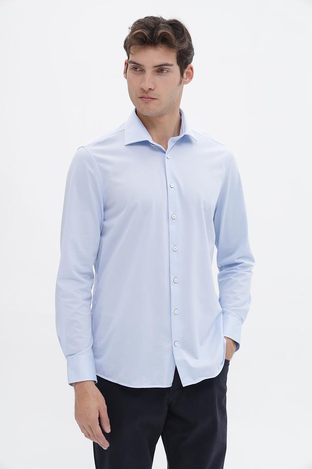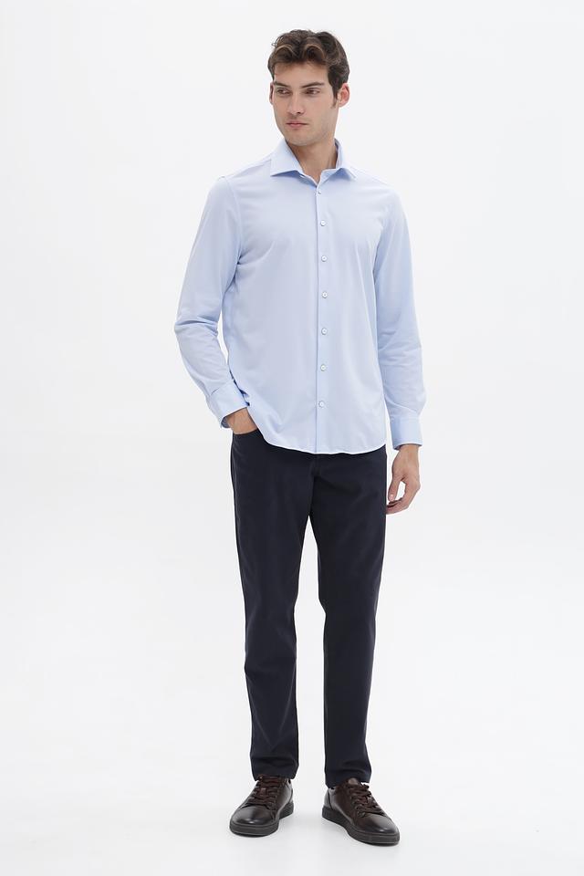 Рубашка имеет приталенный крой, который выгодно подчеркивает силуэт. Классический воротник и манжеты на пуговицах придают ей элегантный вид. Изготовлена из высококачественного хлопка с добавлением полиэстера, что обеспечивает комфорт, износостойкость и простоту в уходе.