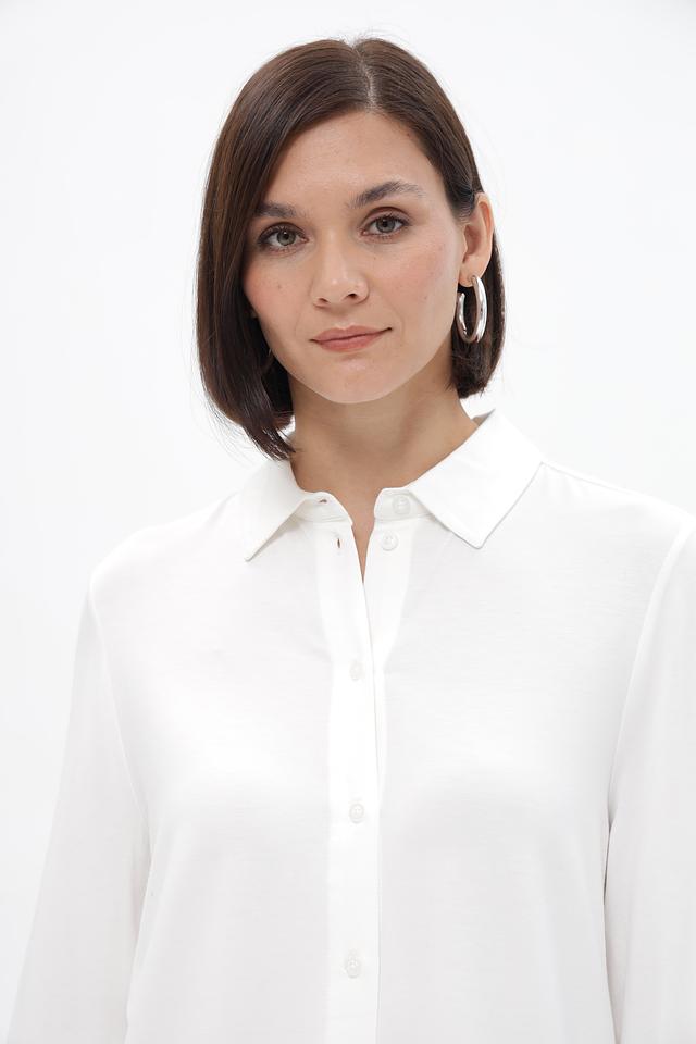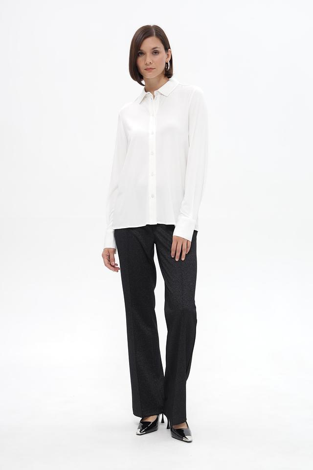 Блузка дополнена воротником классической формы и застежкой на пуговицы по всей длине. Длинные рукава заканчиваются манжетами на пуговицах, что позволяет регулировать их длину и создавать различные образы.