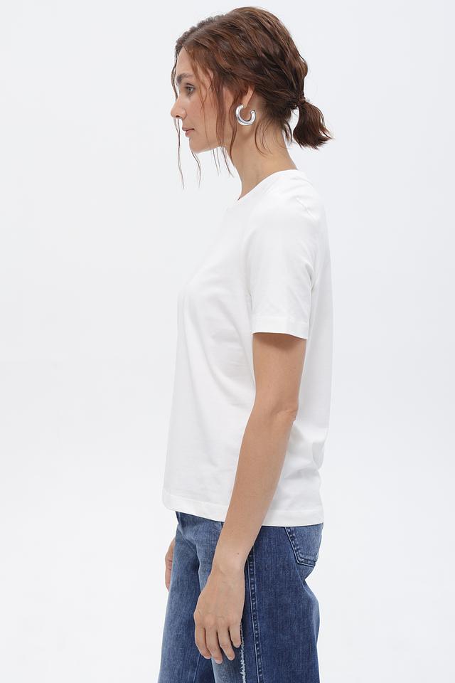 Модель выполнена из качественного хлопка с небольшим добавлением эластана, что обеспечивает приятные тактильные ощущения и удобную посадку по фигуре. Классический крой футболки с круглым вырезом горловины и короткими рукавами делает её универсальной и подходящей для создания различных образов.