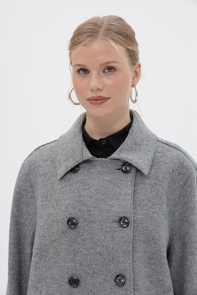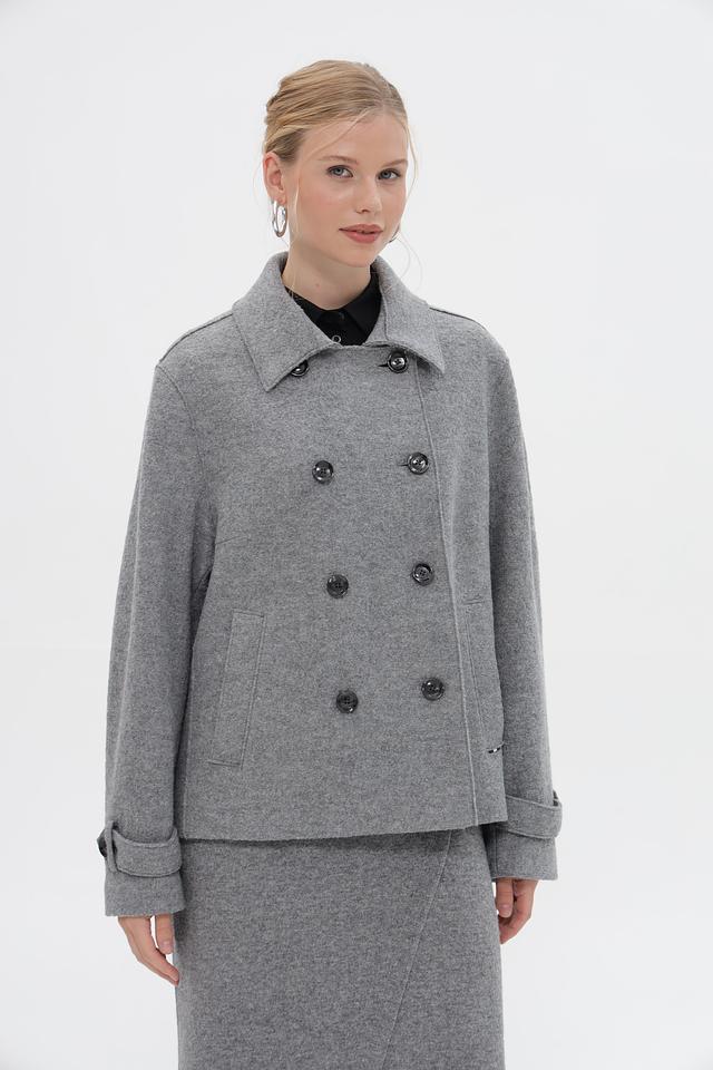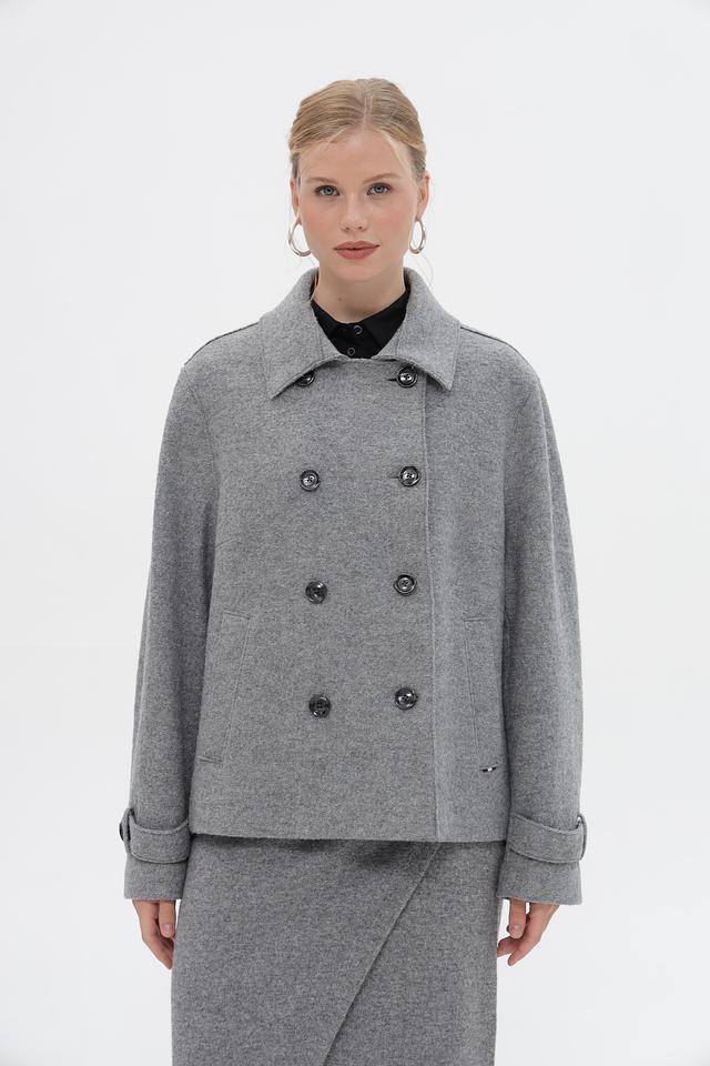 Женская куртка Bugatti серого цвета с двубортной застежкой и широким воротником. Модель выполнена из мягкого материала с добавлением шерсти и вискозы, что обеспечивает комфорт и тепло. Состав: шерсть 50%, вискоза 50%