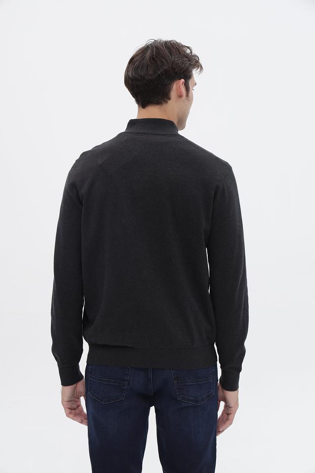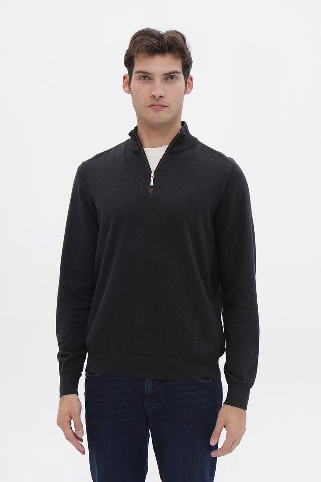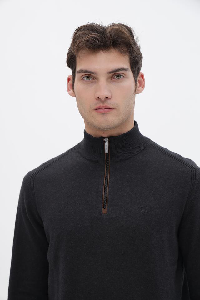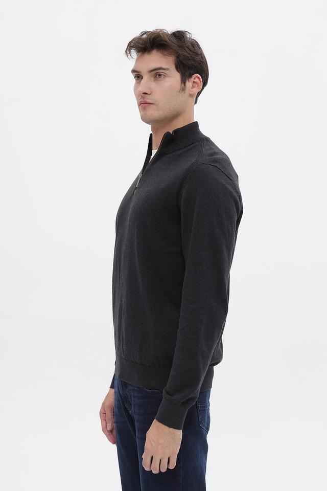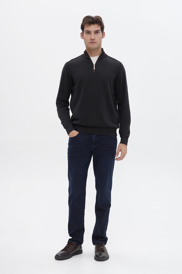 Модель имеет воротник-стойку с короткой молнией, что добавляет ей современный и лаконичный вид. Джемпер имеет длинные рукава и стандартную посадку, обеспечивающую свободу движений. Текстура ткани слегка меланжевая, что придает изделию благородный вид.