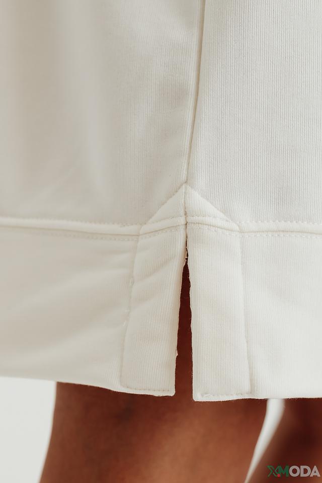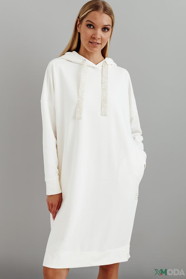 Платье имеет прямой, слегка завышенный силуэт, который обеспечивает свободу движений и комфорт в носке. Особенностью модели является капюшон со шнурками, декорированными вышивкой в тон изделия.