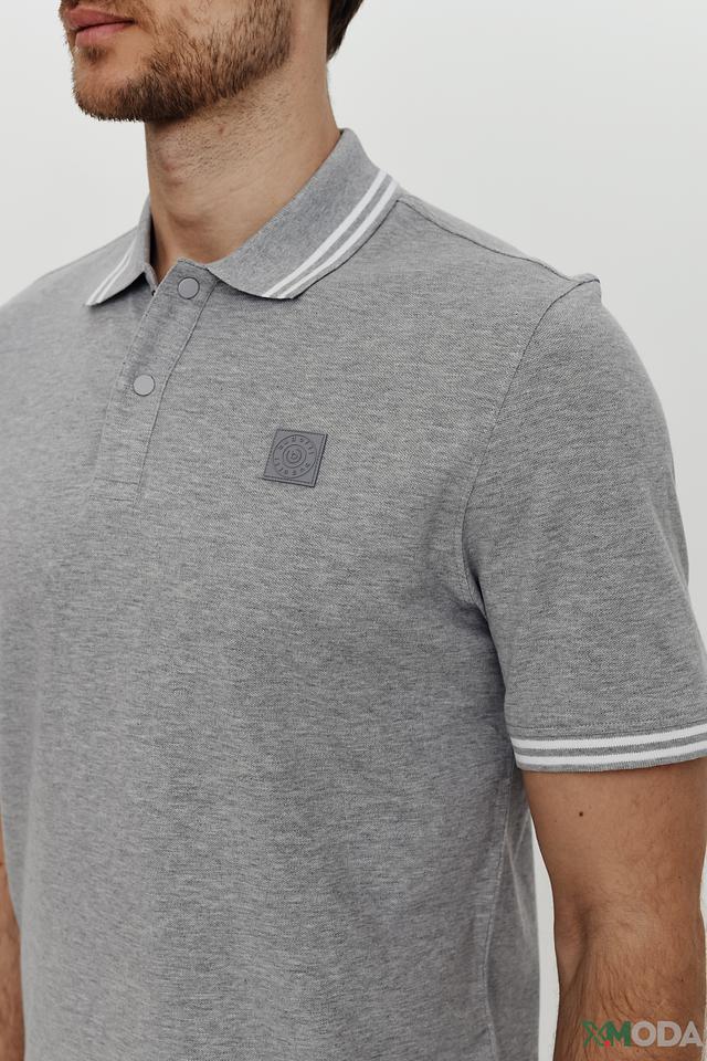 Модель имеет короткие рукава и воротник-поло с контрастной белой и серой полоской. На груди расположена небольшая эмблема бренда. Поло идеально подходит для создания повседневных образов.