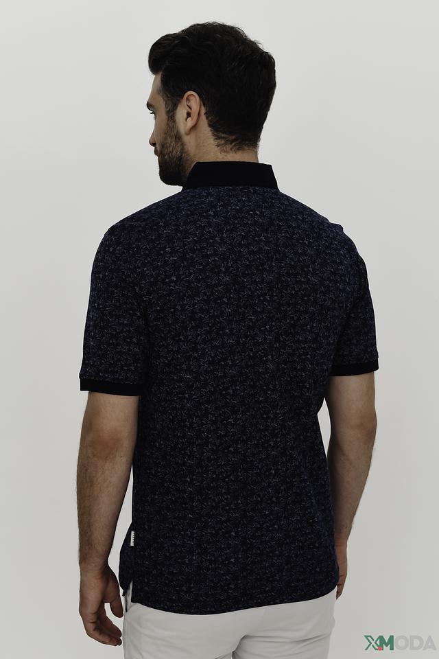 Основной цвет поло – насыщенный синий, украшенный оригинальным узором, который придает изделию индивидуальность. Воротник и манжеты выполнены в контрастном черном цвете, что добавляет поло выразительности.