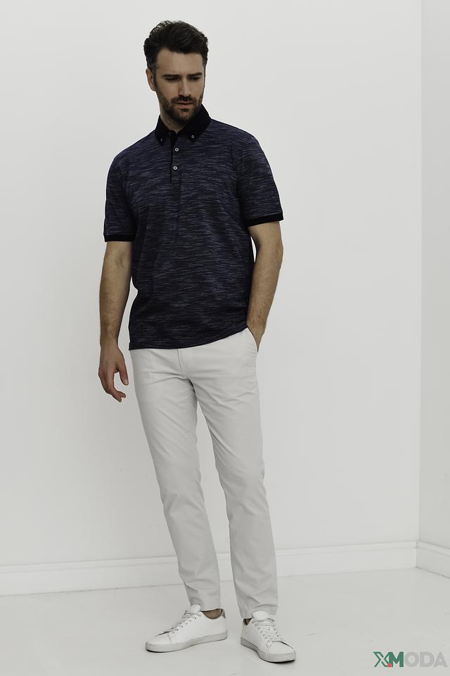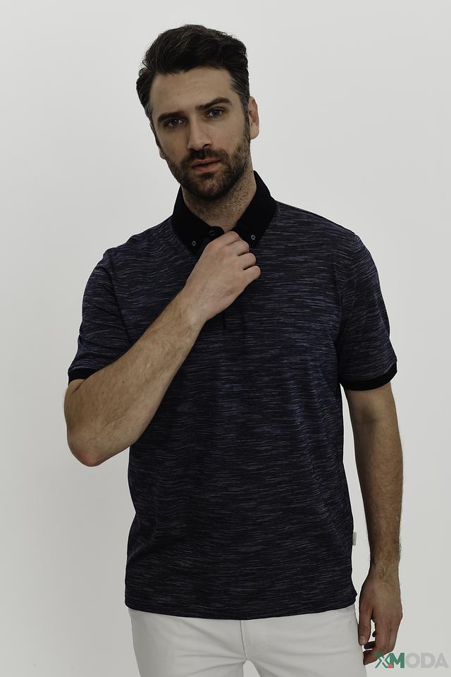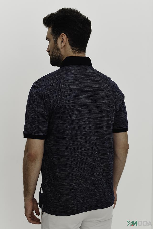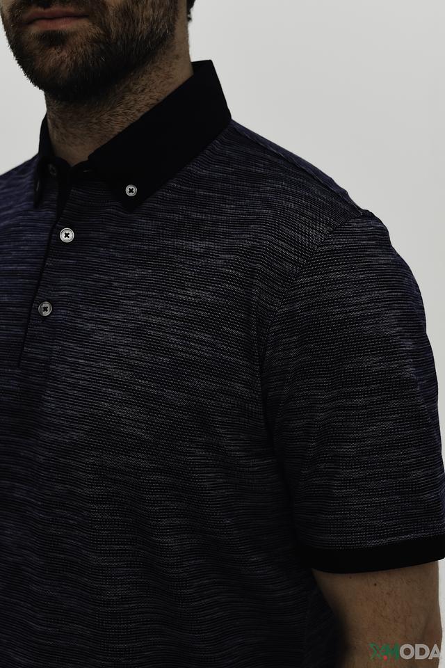 Дизайн поло выполнен в тёмно-синем цвете с интересным текстурированным узором, который придает изделию особый шарм. Воротник поло также выполнен в тёмно-синем цвете, создавая гармоничный образ.