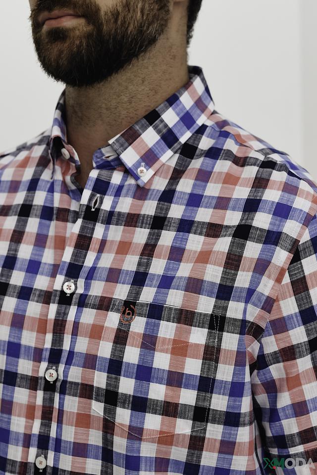 Рубашка выполнена в яркой клетчатой расцветке, сочетающей в себе оттенки синего, красного и белого. Классический крой и приталенный силуэт подчеркивают фигуру, а воротник button-down добавляет образу аккуратность.