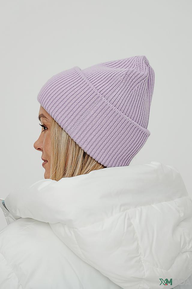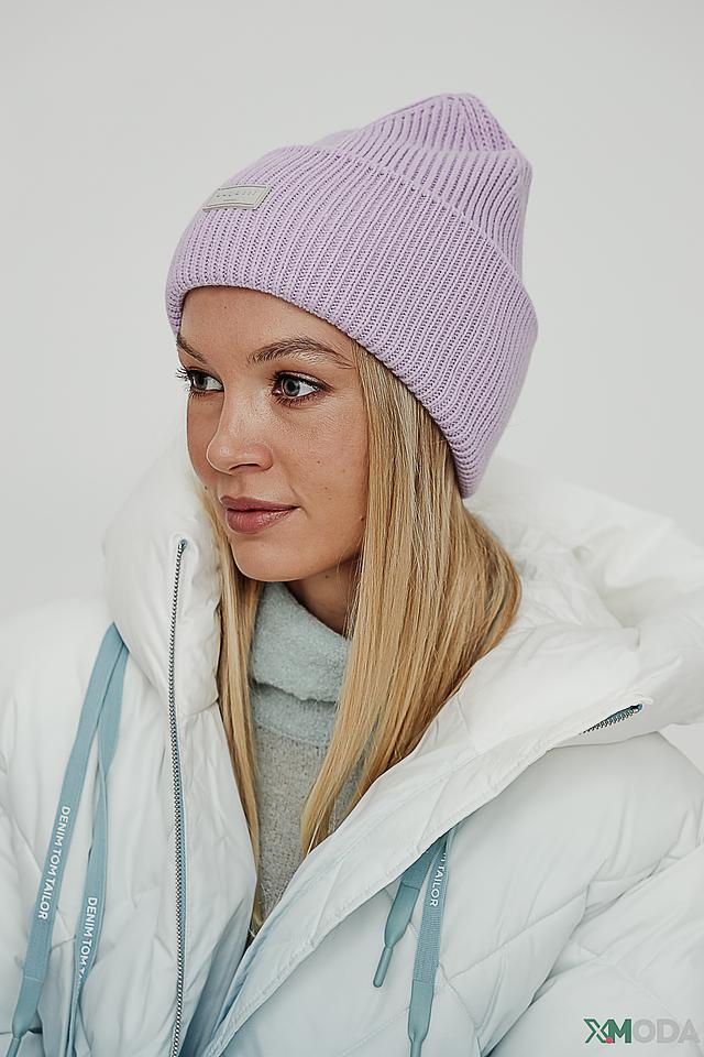 Шапка имеет классическую вязаную текстуру и лавандовый цвет, который легко сочетается с различными образами. Небольшой логотип бренда, аккуратно расположенный на передней части шапки, добавляет ей изысканности.