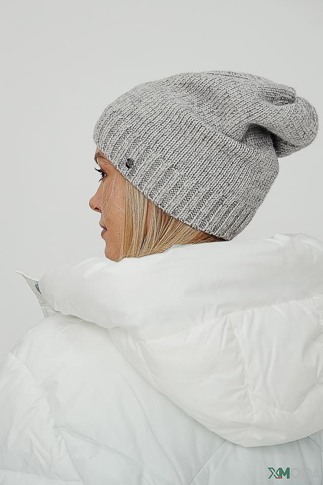 Шапка имеет классический дизайн и нейтральный серый цвет, который легко сочетается с различными элементами одежды. Вязаная текстура придает ей уютный и непринужденный вид. Небольшой декоративный элемент с логотипом бренда добавляет шапке изысканности.