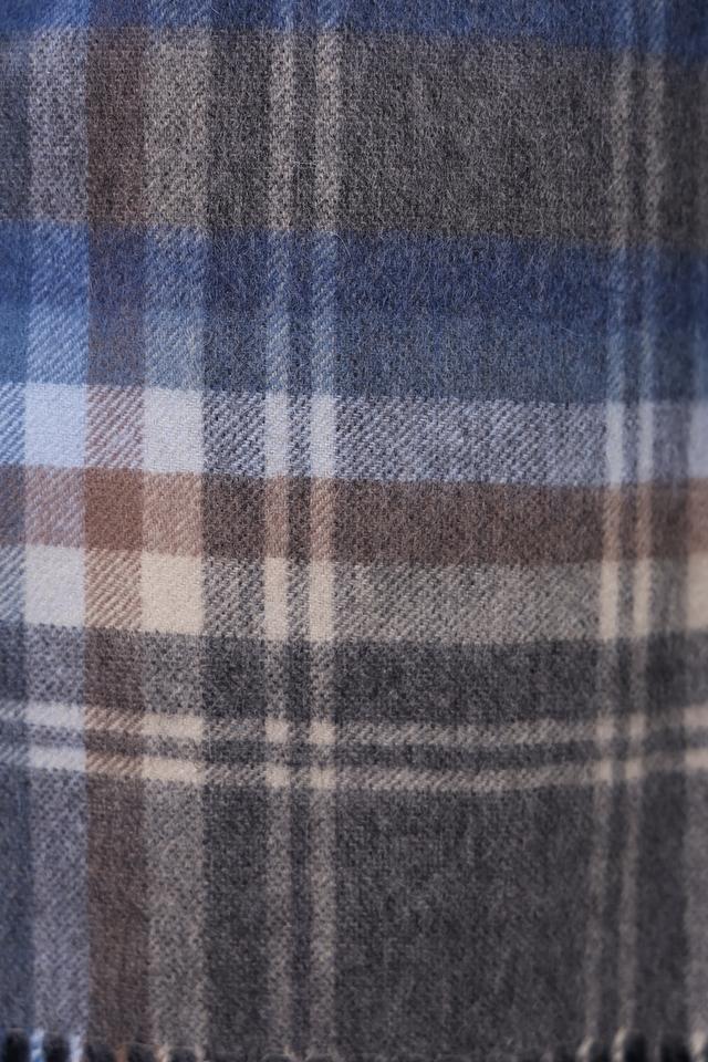 Шарф выполнен в классической клетке, сочетающей в себе оттенки синего, коричневого и бежевого. Бахрома по краям придает шарфу законченный и элегантный вид.