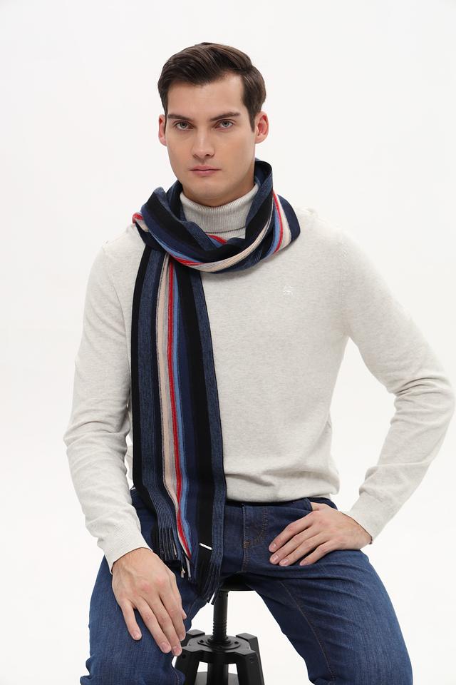 Основной цвет шарфа – тёмно-синий, дополненный полосами красного, белого и светло-голубого цветов. Такое сочетание делает его универсальным и подходящим к различным стилям одежды.