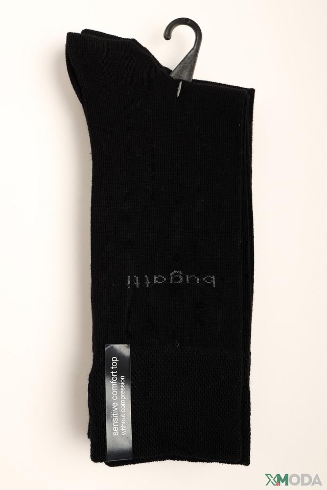 На носках расположен логотип бренда Bugatti. Текстура вязки обеспечивает комфортное ношение. На изделии присутствует этикетка с информацией о технологии "sensitive comfort top without compression", что говорит об особом комфорте при носке.