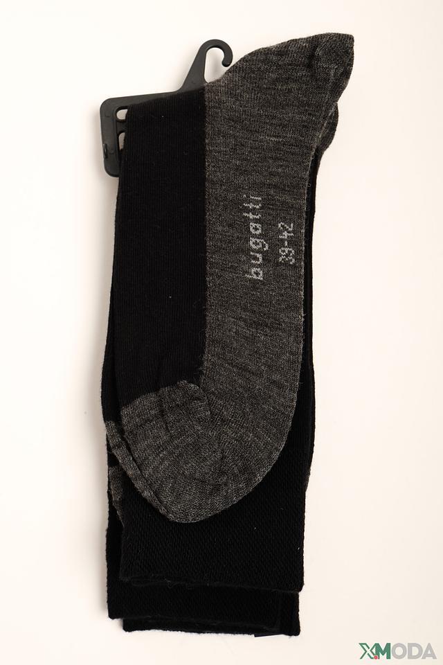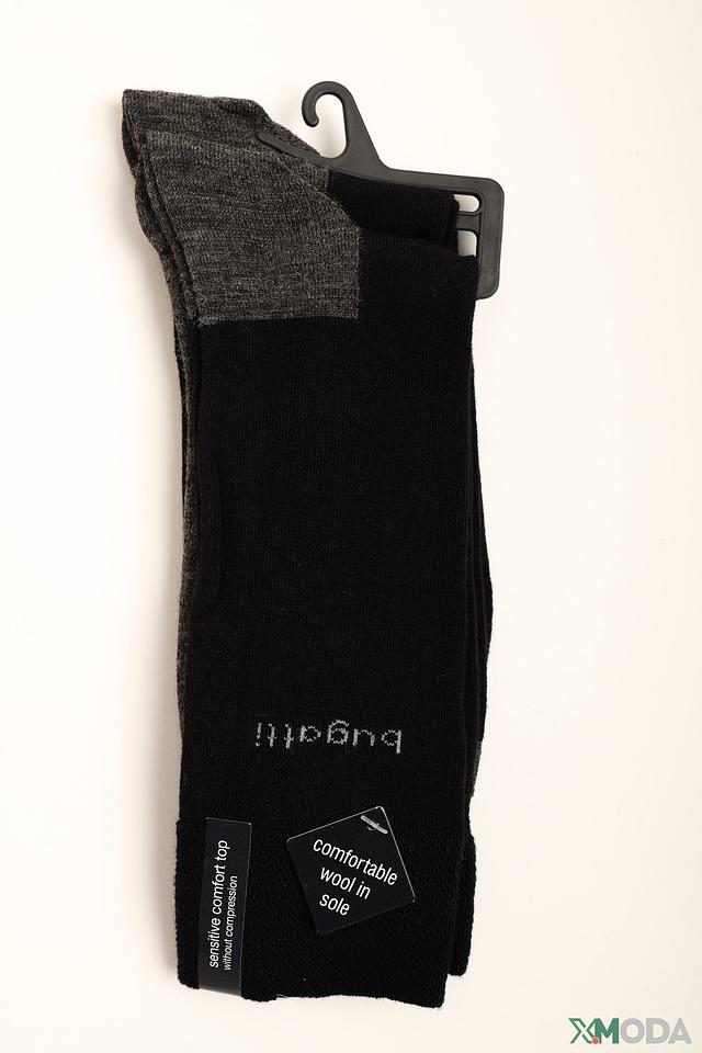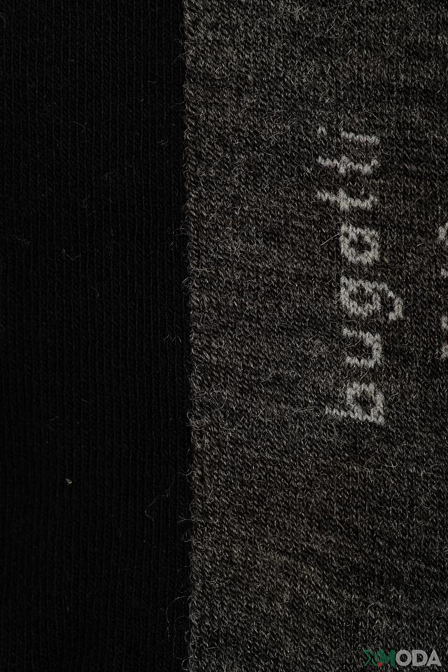 На носках присутствует логотип бренда Bugatti, выполненный в сером цвете. Также на носках имеется надпись "comfortable wool in sole", что указывает на наличие шерсти в подошве для дополнительного комфорта. Носки представлены в комплекте из двух пар.
