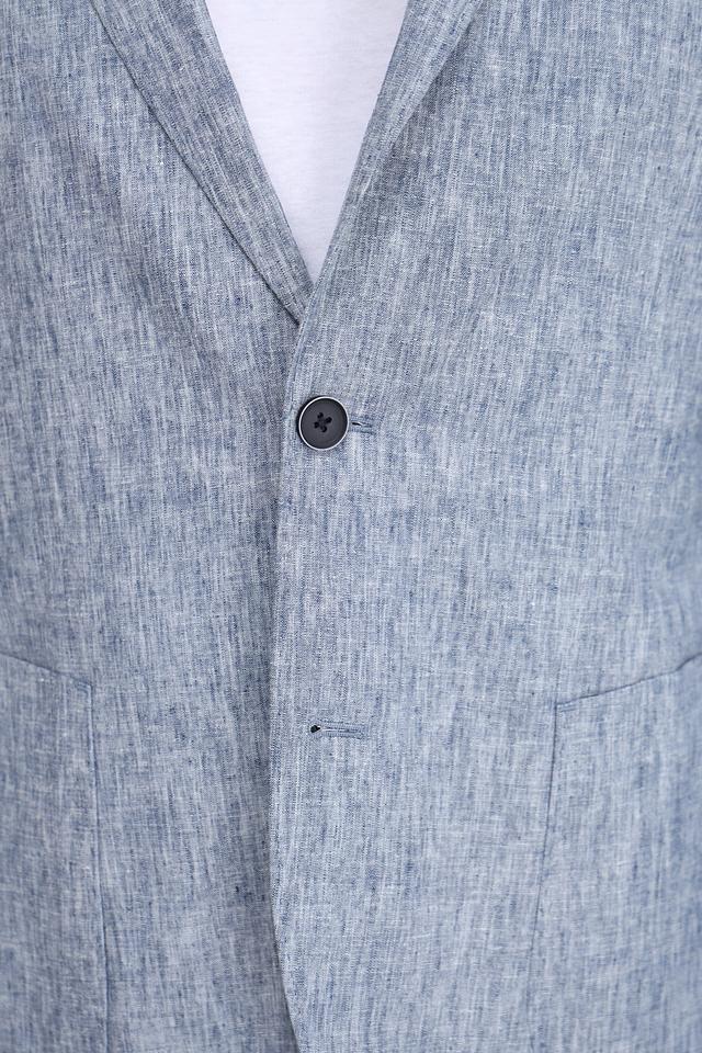 Пиджак имеет классический крой, который подходит для большинства типов фигур. Голубой цвет с текстурой льна придаёт изделию свежий и современный вид. Застёжка на две пуговицы, аккуратный лацкан и функциональные карманы делают этот пиджак практичным и универсальным.