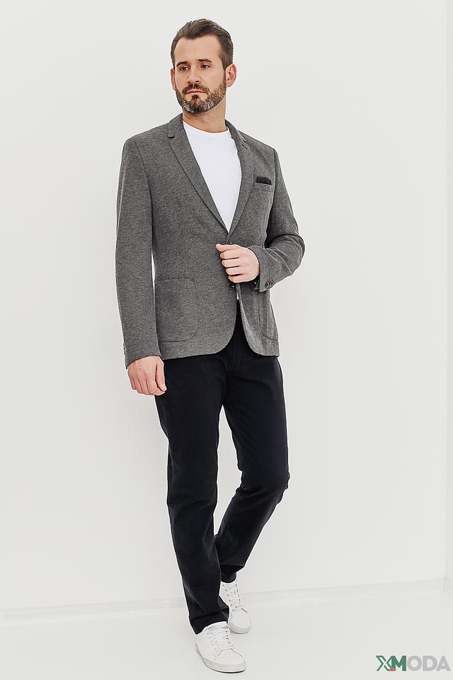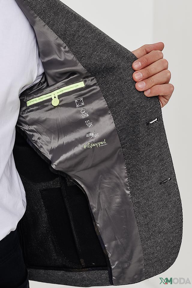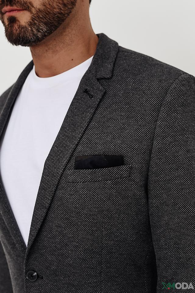 Пиджак однобортный, застегивается на одну пуговицу. Воротник с лацканом добавляет элегантности. На левой стороне пиджака имеется накладной карман, выполненный из вельвета. Рукава пиджака имеют стандартную длину.