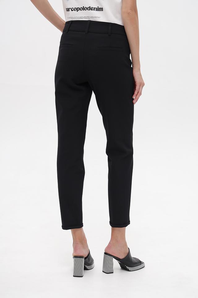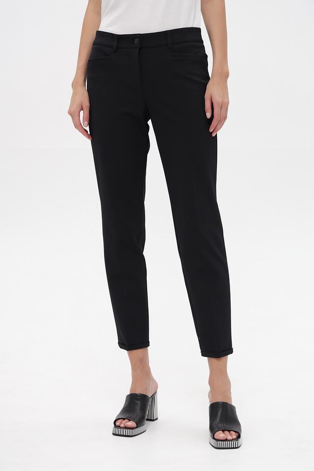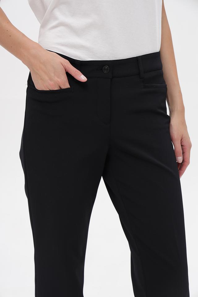 Брюки имеют прямой крой, который визуально вытягивает силуэт и обеспечивает комфортную посадку. Благодаря составу из 88% полиамида и 12% эластана, они приятны к телу, хорошо держат форму и практически не мнутся.