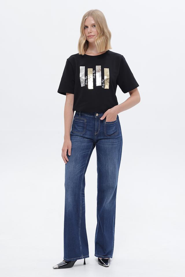 Джинсы оформлены декоративными накладными карманами с контрастной отделкой, что добавляет им оригинальности. Застежка на пуговицу и молнию. Пятикарманный крой — классическое решение для джинсов, обеспечивающее практичность и удобство.