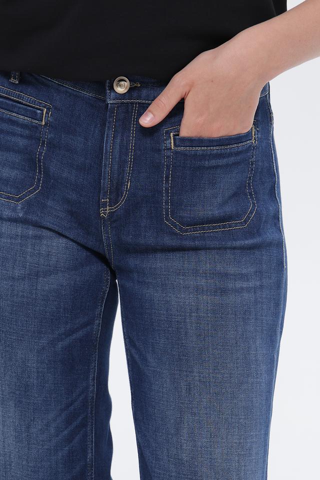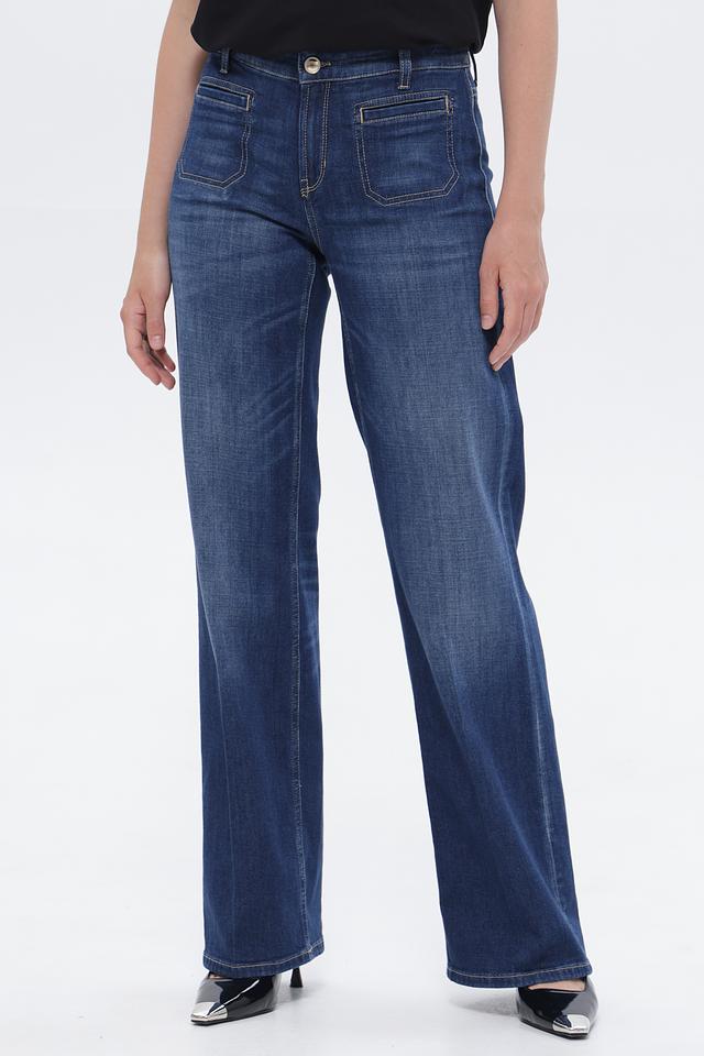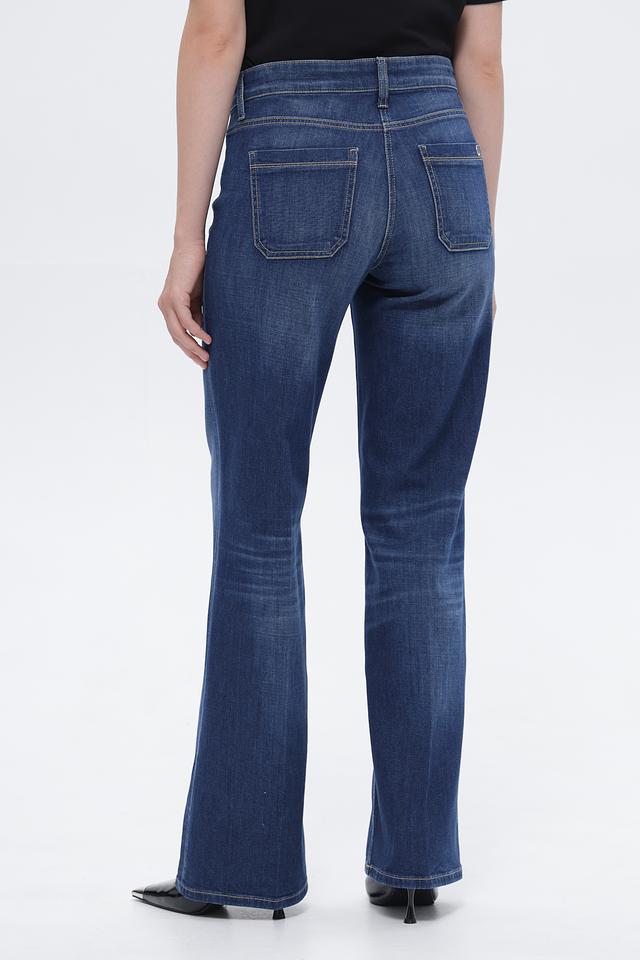Синие джинсы клеш от Cambio из хлопка с добавлением эластана. Модель с высокой посадкой, оформленная декоративными накладными карманами. Состав: 92% хлопок, 6% эластомультиэстер, 2% эластан. Состав: хлопок 92%, эластомультиэстер 6%, эластан 2%