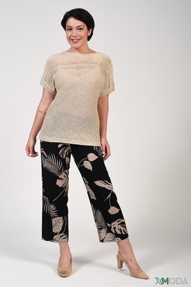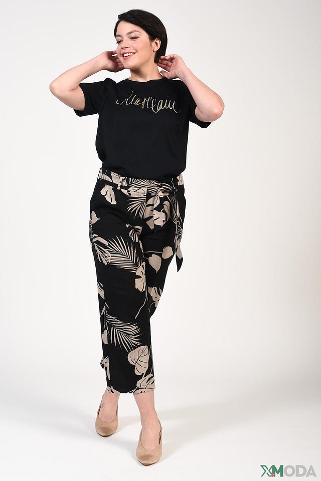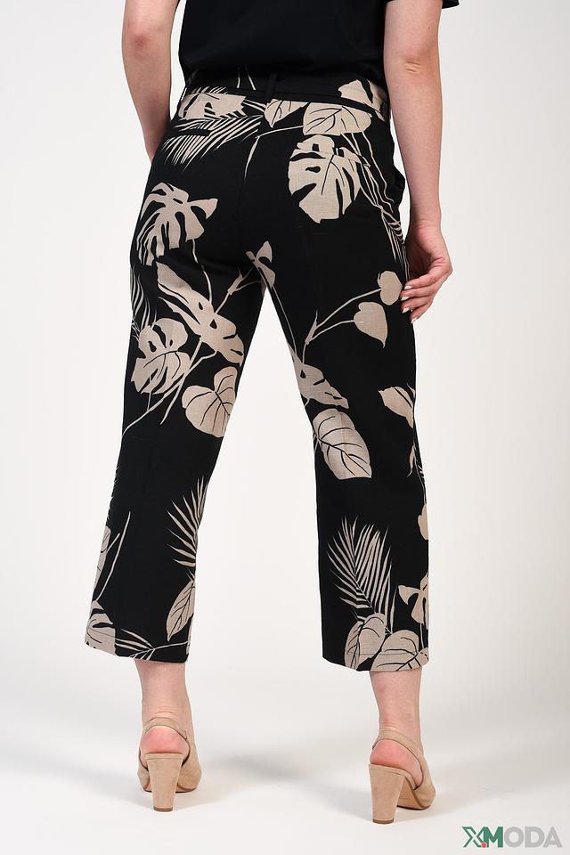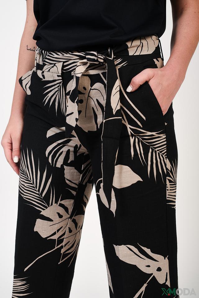 Особенностью модели является яркий и запоминающийся принт с изображением листьев пальмы в бежевых тонах на чёрном фоне. Брюки легко сочетаются с различными видами верха – от простых футболок до элегантных блузок. Они подойдут для повседневной носки, прогулок по городу или отдыха на природе.