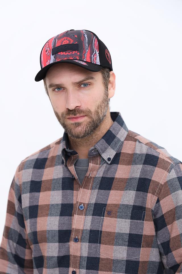 Мужская бейсболка Carlo Colucci чёрного цвета с ярким этническим принтом на козырьке. Модель выполнена из хлопка с добавлением эластана для комфортной посадки и долговечности. Регулируемый ремешок обеспечивает оптимальную посадку. Состав: хлопок 95%, эластан 5%
