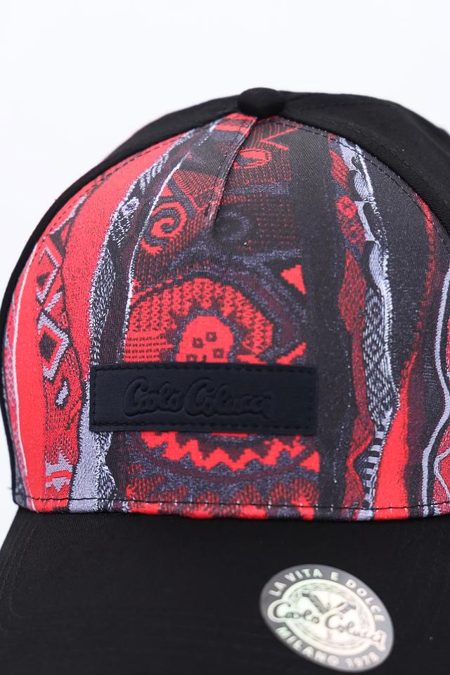 Эта стильная бейсболка от Carlo Colucci станет отличным дополнением к вашему образу. Выполнена в чёрном цвете с акцентным козырьком, украшенным ярким этническим принтом в красных и серых тонах.