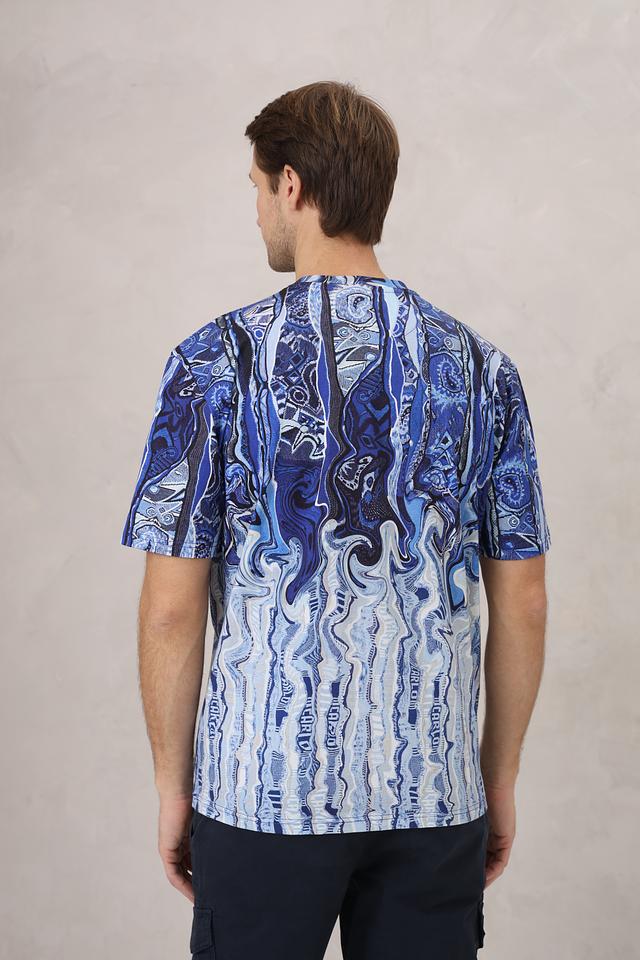 Мужская футболка Carlo Colucci синего цвета с ярким геометрическим принтом и логотипом бренда. Изготовлена из 100% хлопка, обеспечивающего комфорт и воздухопроницаемость. Состав: хлопок 100%