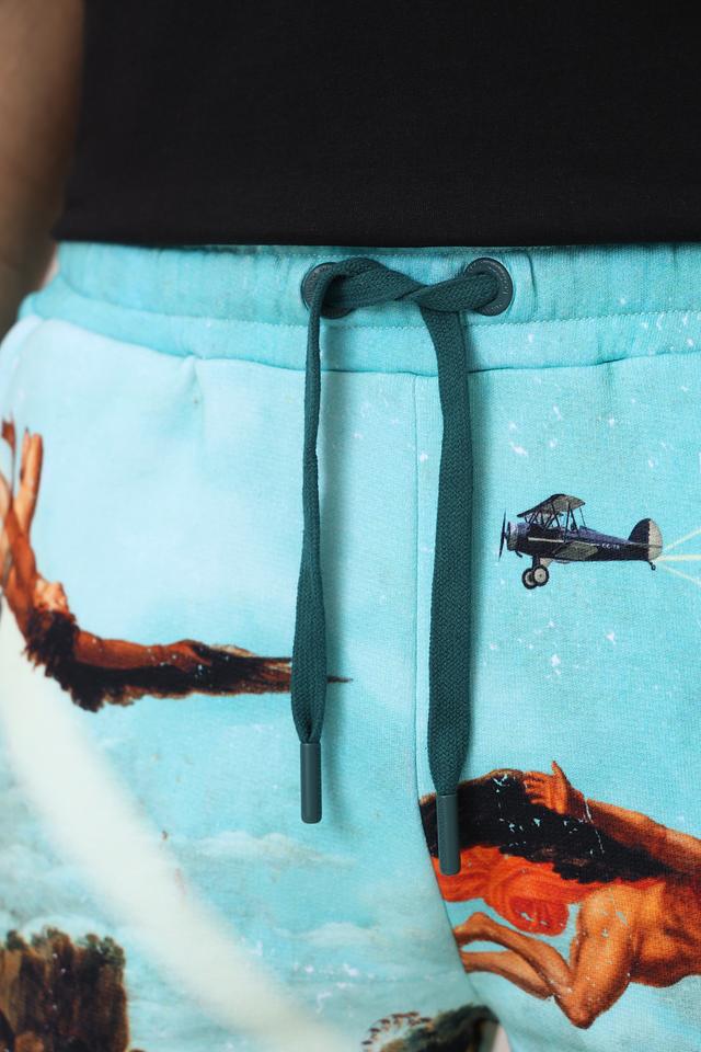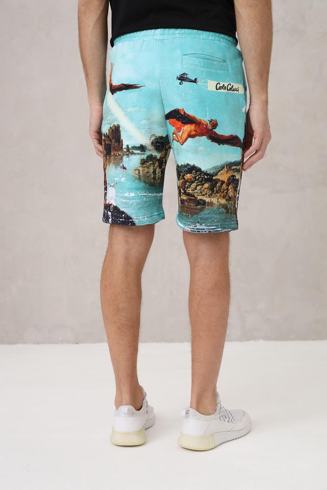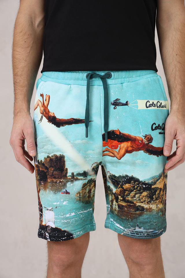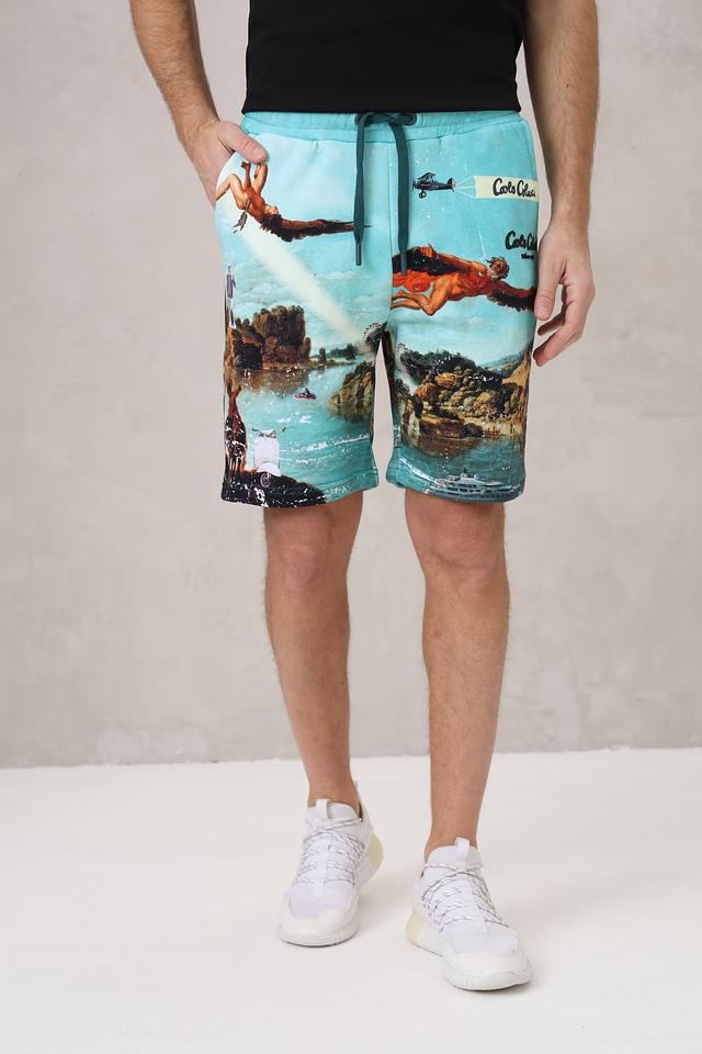 Мужские шорты Carlo Colucci бирюзового цвета с ярким принтом в виде пейзажа и летательных аппаратов. Модель выполнена из мягкого хлопка и оснащена удобным шнурком на поясе. Состав: хлопок 100%