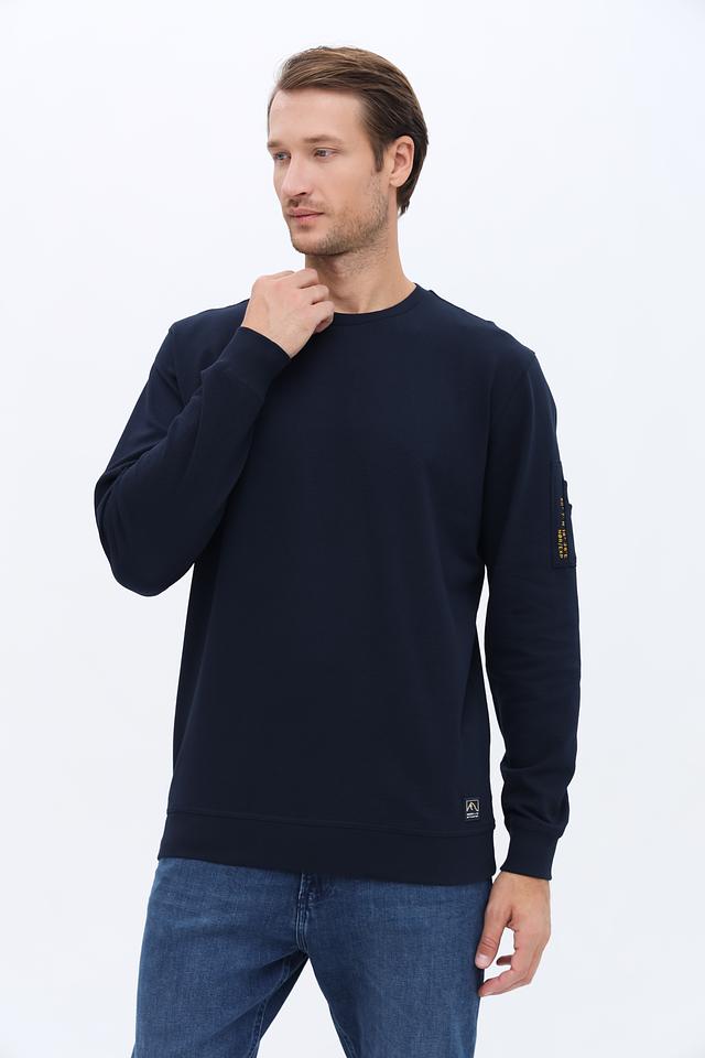 Модель имеет прямой крой, круглый вырез горловины и длинные рукава с манжетами. На левом рукаве расположен накладной карман с декоративной отделкой, добавляющий образу динамичности.