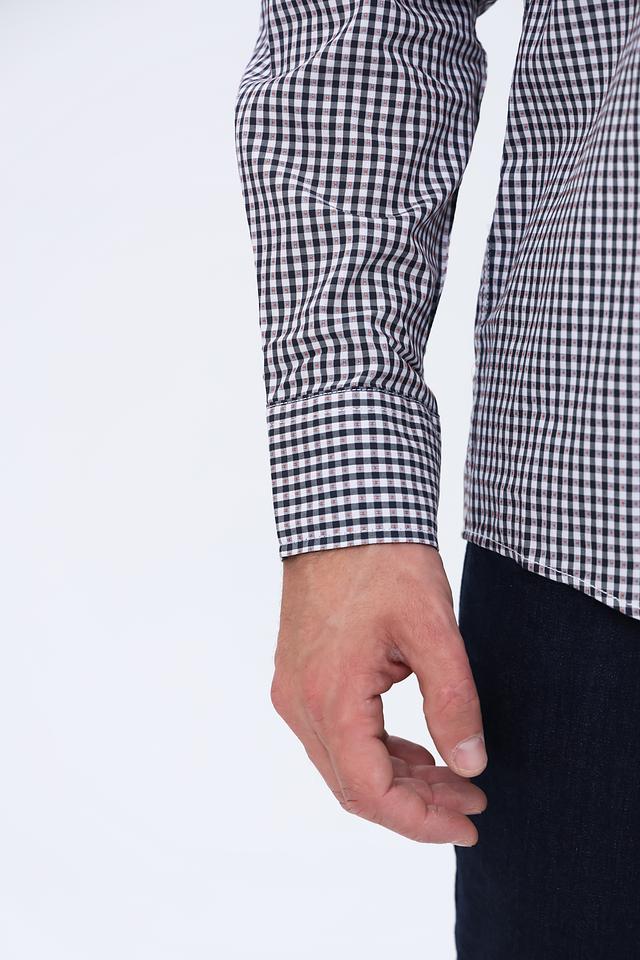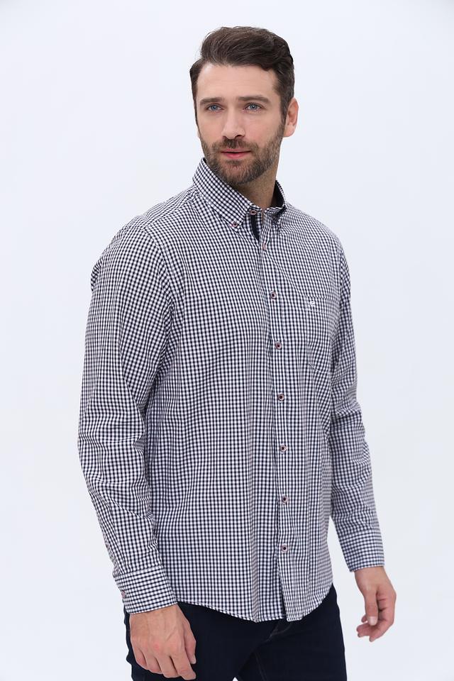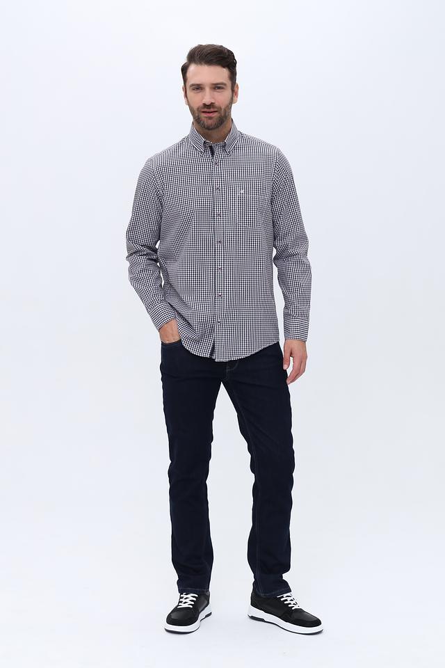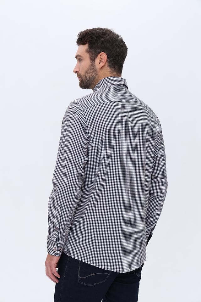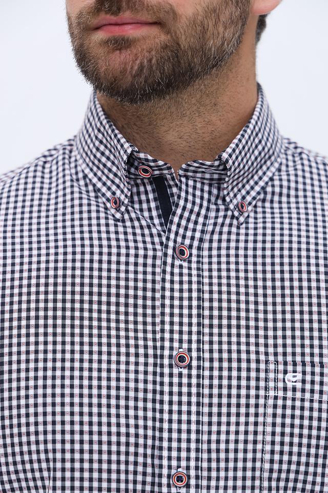 Рубашка имеет классический крой и оформлена в синюю клетку, что делает ее универсальной и подходящей для различных стилей. Воротник рубашки выполнен в классическом стиле, а пуговицы имеют контрастный красный оттенок, добавляя изюминку в общий дизайн.