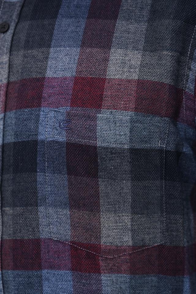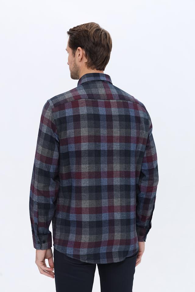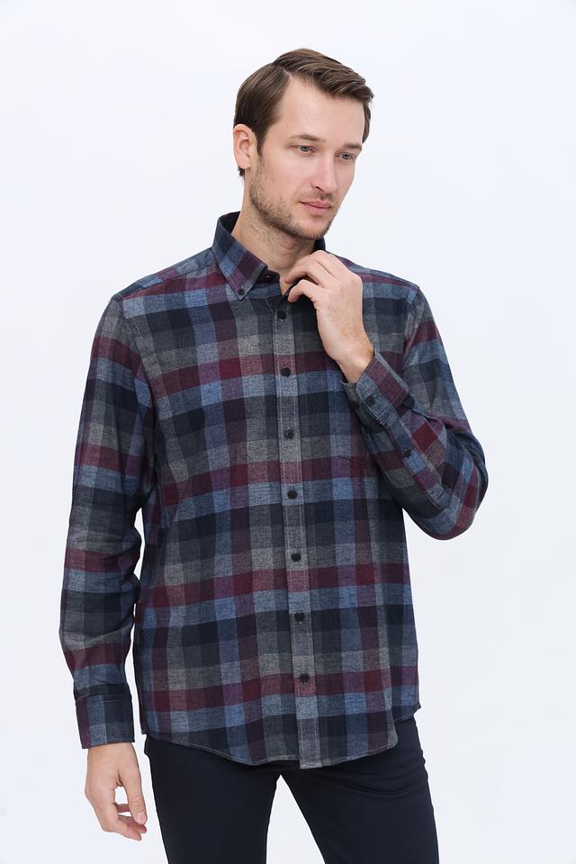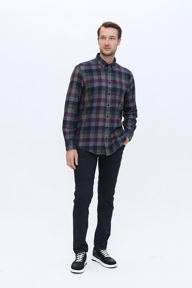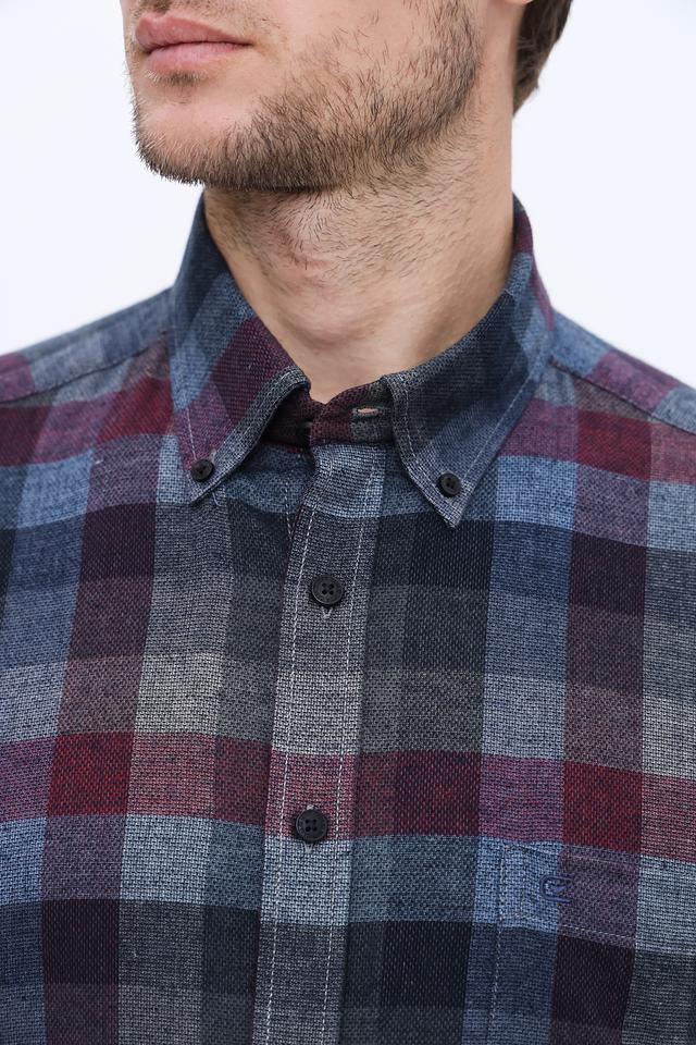 Дизайн рубашки представлен классической клеткой, сочетающей в себе оттенки бордового, синего и серого. Такая расцветка делает рубашку универсальной и легко сочетаемой с различными элементами гардероба.