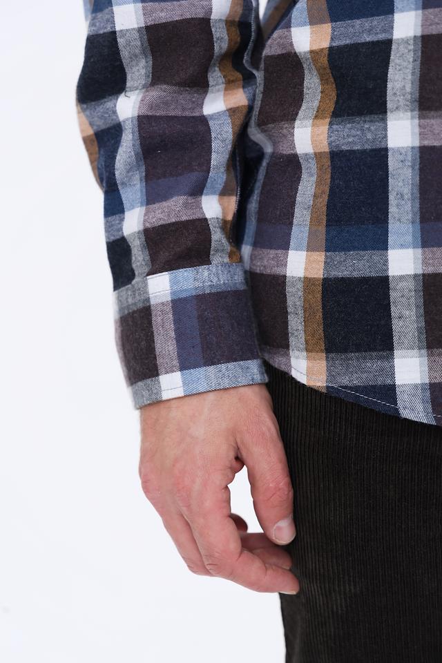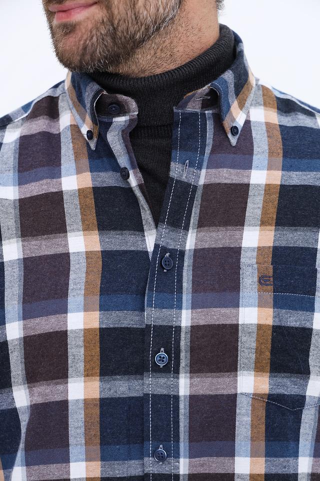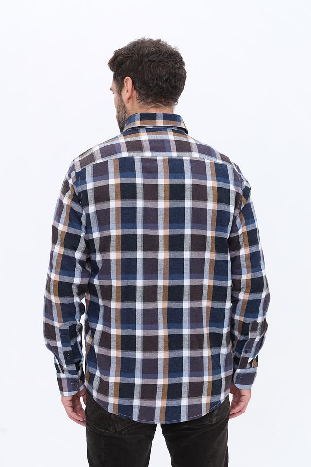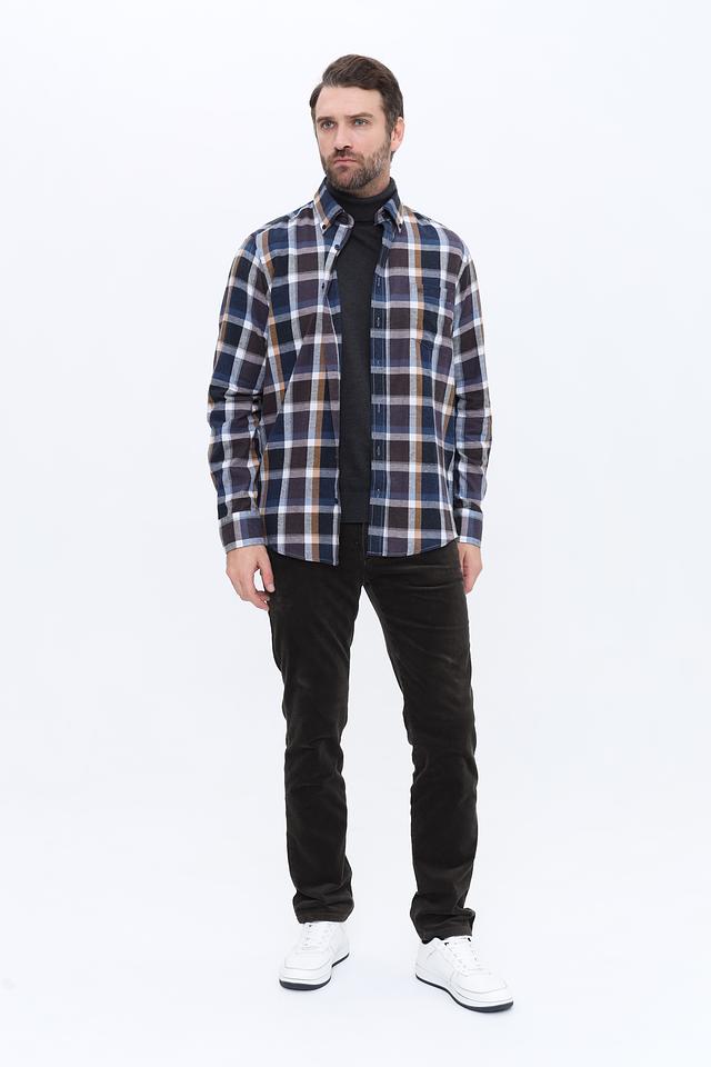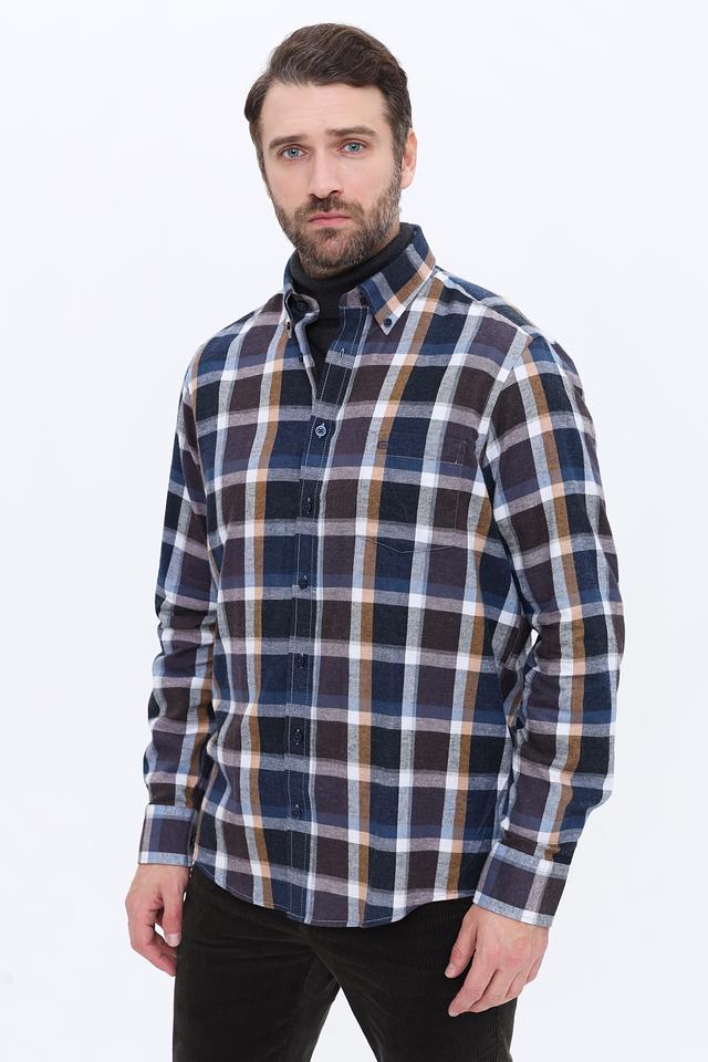 Рубашка выполнена в классическом крое с длинными рукавами и традиционным воротником. Её отличает яркий клетчатый рисунок, сочетающий в себе оттенки синего, коричневого и белого. Эта рубашка станет прекрасным дополнением к вашему гардеробу и позволит создавать разнообразные образы.