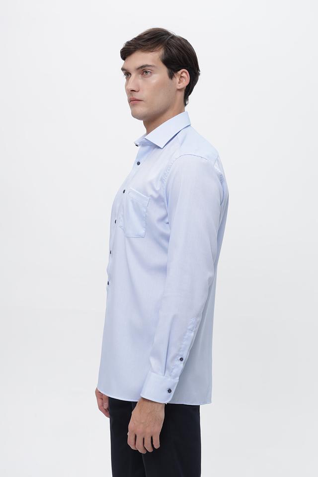 Рубашка имеет классический крой с длинными рукавами и приталенный силуэт. Застежка на пуговицы по всей длине, нагрудный карман с пуговицей. Воротник рубашки классической формы, манжеты на пуговицах.