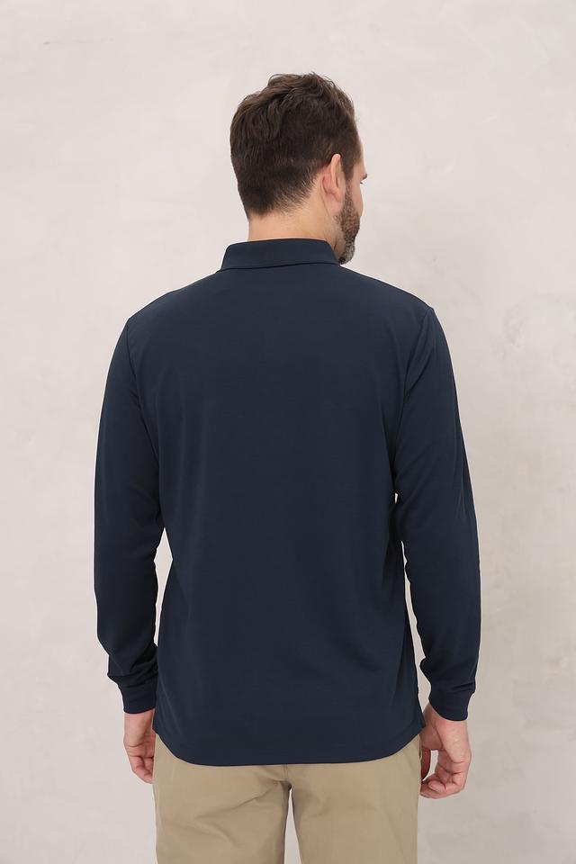 Это мужское поло от бренда Casa Moda выполнено в классическом стиле с длинным рукавом. Основной цвет – темно-синий, глубокий и насыщенный.