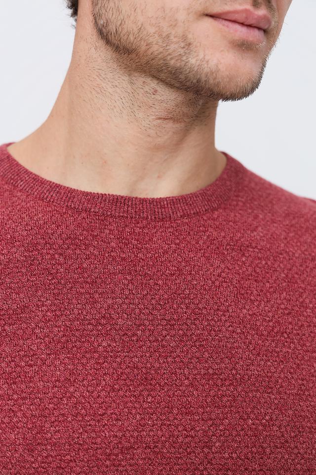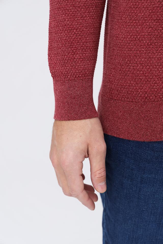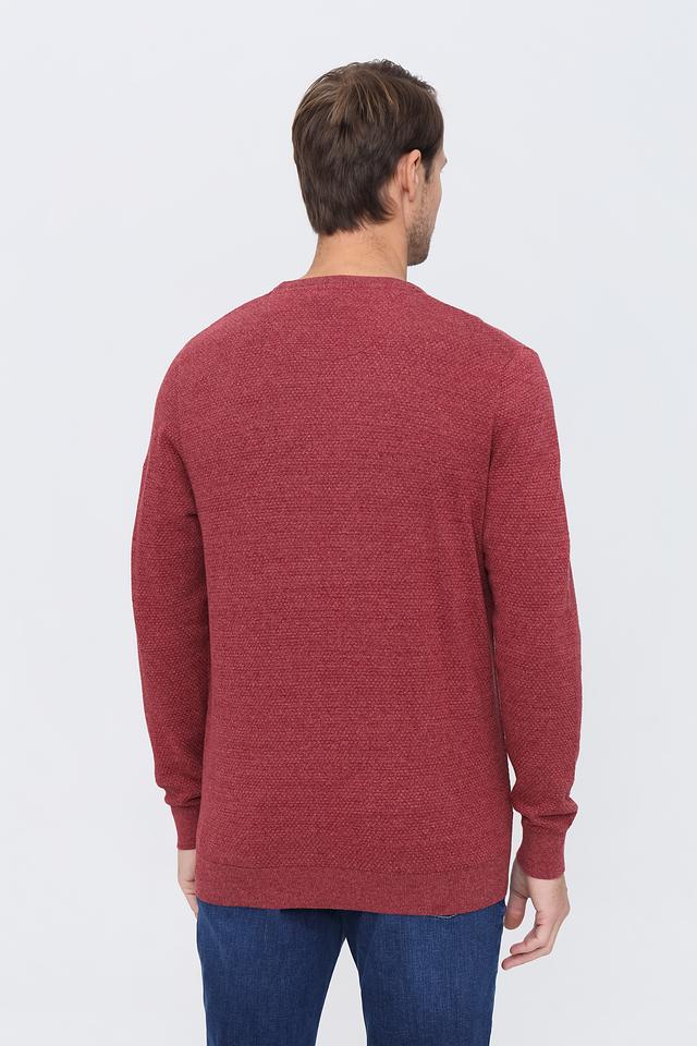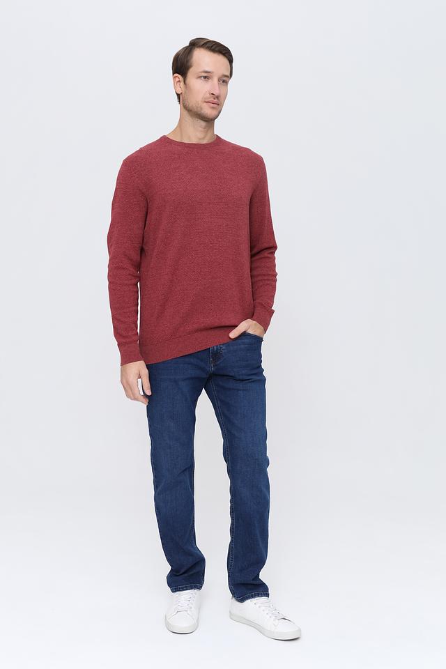 Джемпер имеет бордовый цвет и фактурную вязку, которая придает ему интересный вид. Классический крой и полукруглый вырез горловины делают его универсальным для различных случаев. Он хорошо сочетается с джинсами, брюками чинос и другой повседневной одеждой.
