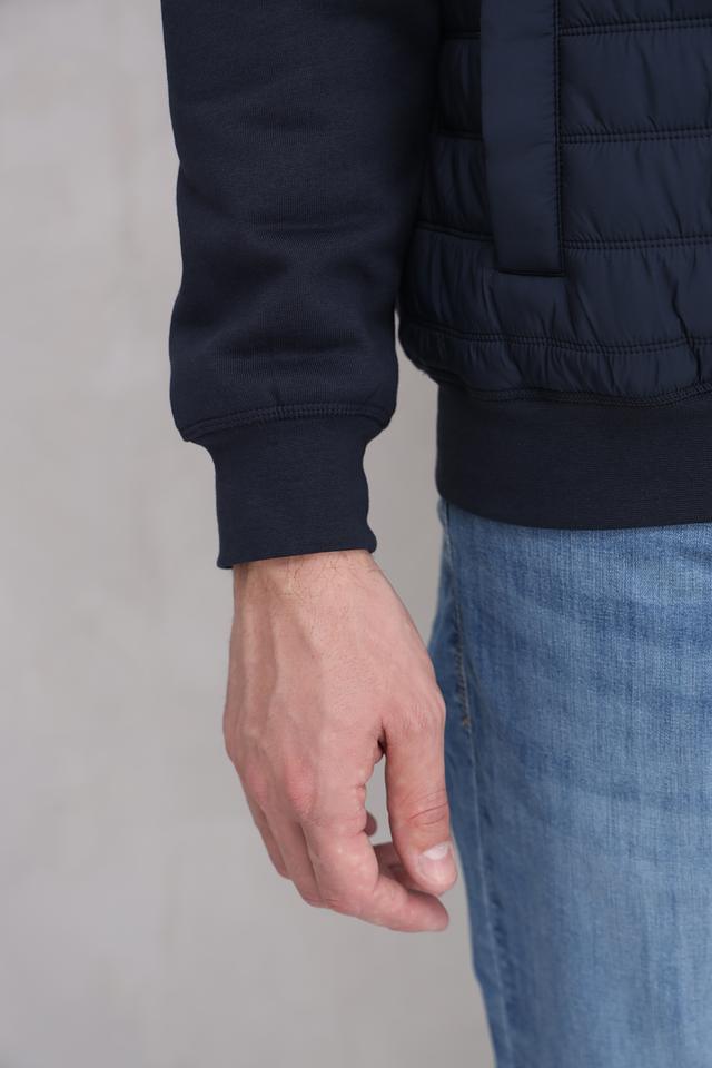 Модель имеет стеганую фактуру, которая придает ей современный вид. Контрастная отделка оканта по горловине, планке и манжетам добавляет акцент и делает кардиган более интересным. Застежка-молния позволяет регулировать степень теплоты и создавать различные силуэты.