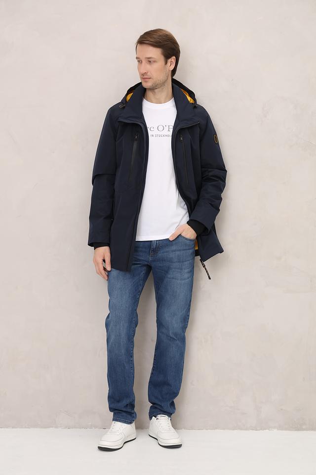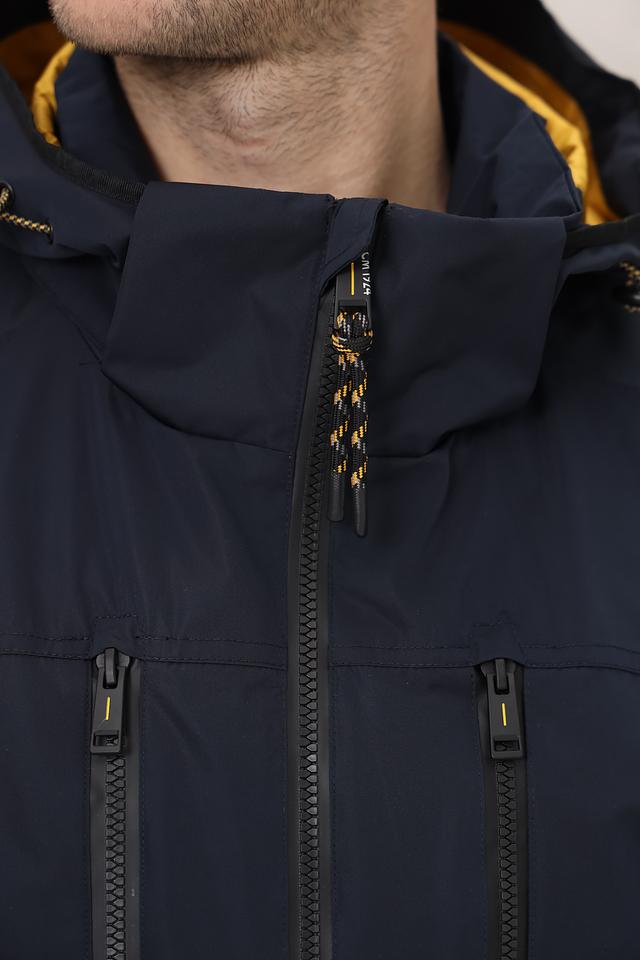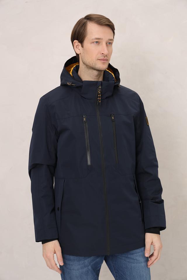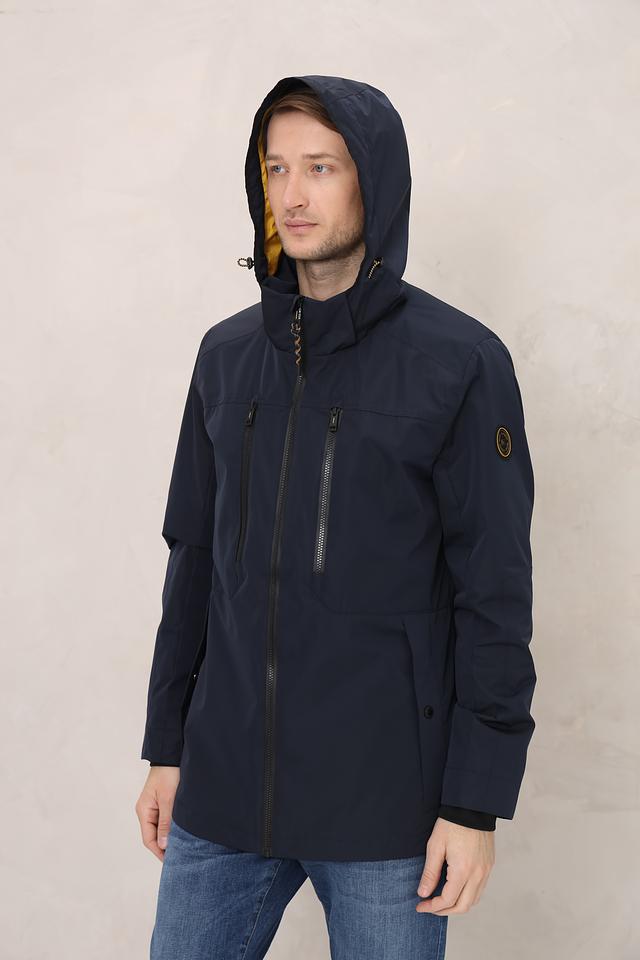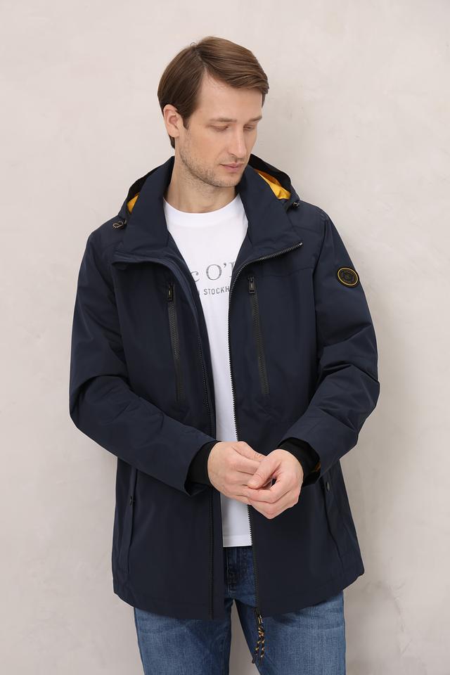 Мужская куртка Casa Moda синего цвета с капюшоном и жёлтой подкладкой. Модель оснащена удобной застёжкой-молнией и боковыми карманами, а также имеет декоративные элементы на рукавах и груди. Состав: полиэстер 100%