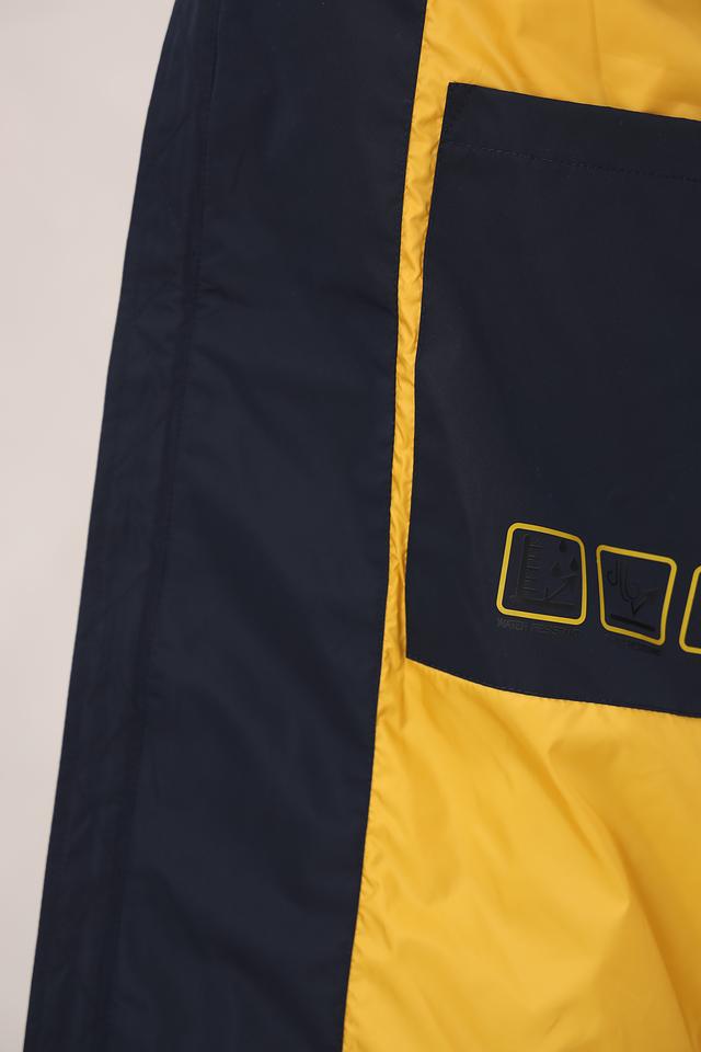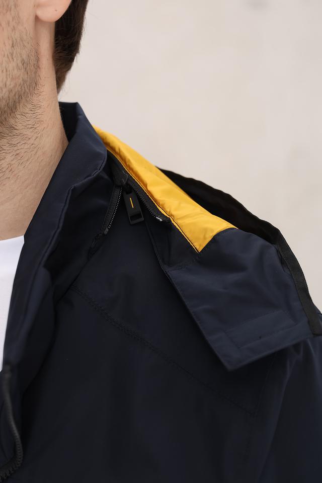 Модель оснащена центральной застёжкой-молнией и боковыми карманами для хранения мелочей. Жёлтая подкладка добавляет яркости и контраста. На рукаве и груди расположены декоративные элементы в виде логотипа бренда.