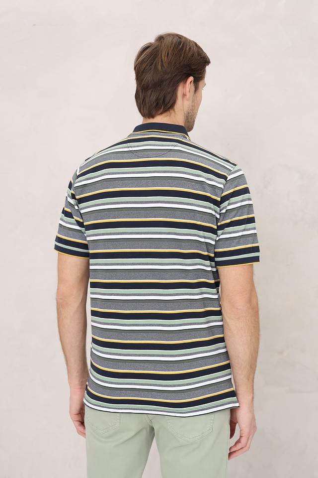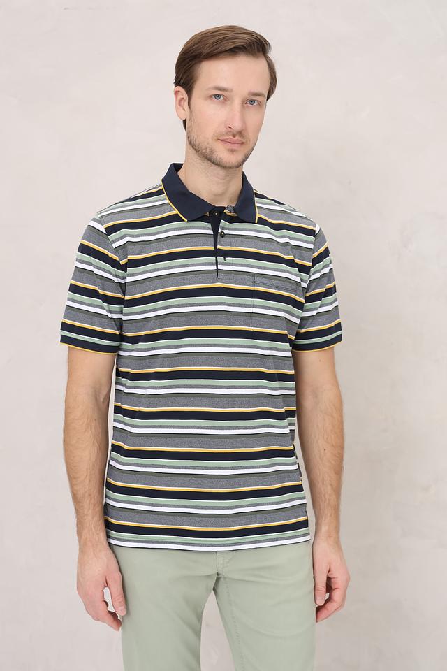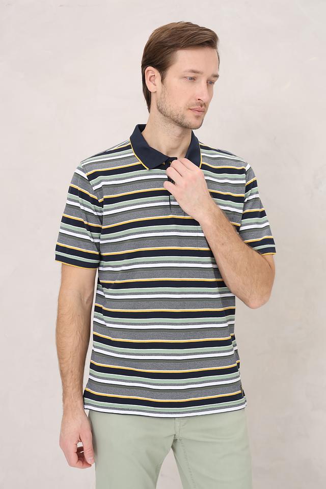 Мужское поло Casa Moda выполнено в классической полосатой расцветке с использованием сочетания синего, зелёного и жёлтого цветов. Модель с коротким рукавом и воротником-поло станет отличным дополнением к вашему гардеробу. Состав: полиэстер 50%, хлопок 50%