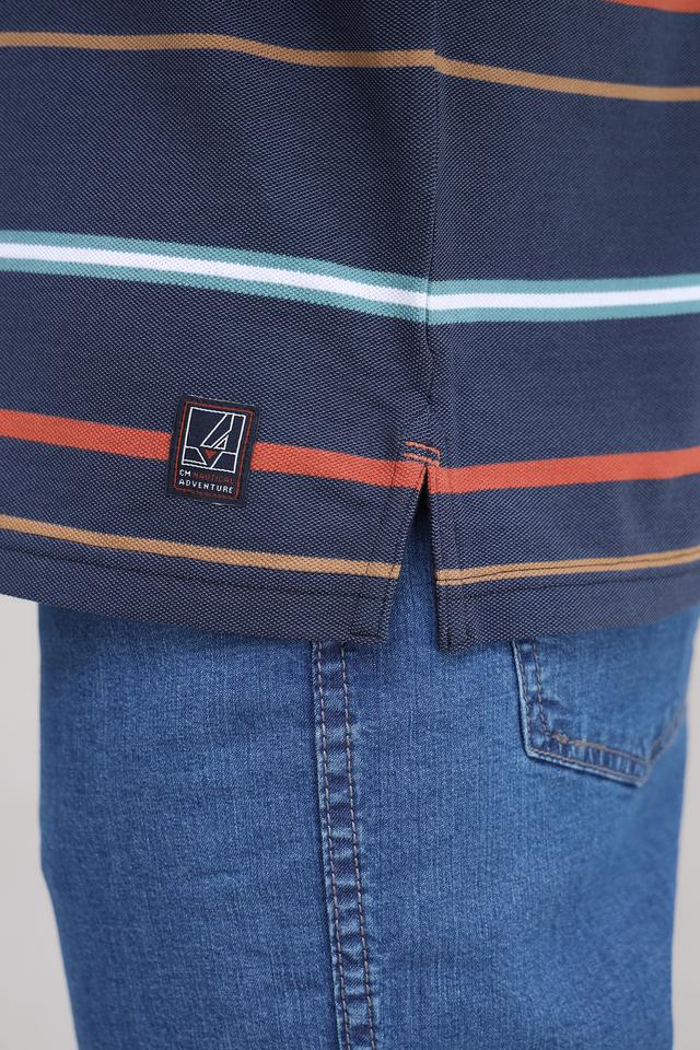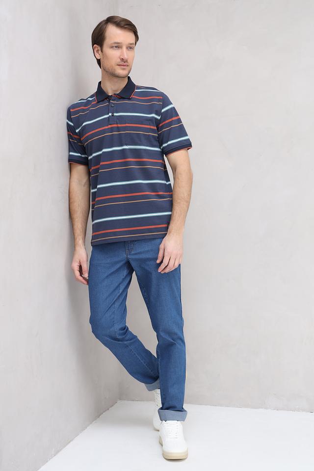 Мужское поло Casa Moda синего цвета с ярким полосатым принтом. Изготовлено из сочетания хлопка и полиэстера, обеспечивающего комфорт и практичность. Классический крой и короткий рукав делают эту модель универсальной для повседневной носки. Состав: полиэстер 50%, хлопок 50%