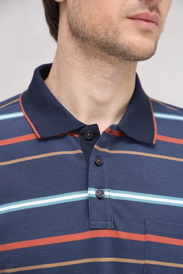 Это мужское поло от бренда Casa Moda выполнено в классическом стиле с ярким полосатым рисунком. Основной цвет – тёмно-синий, дополненный полосами красного, белого, горчичного и бирюзового оттенков.