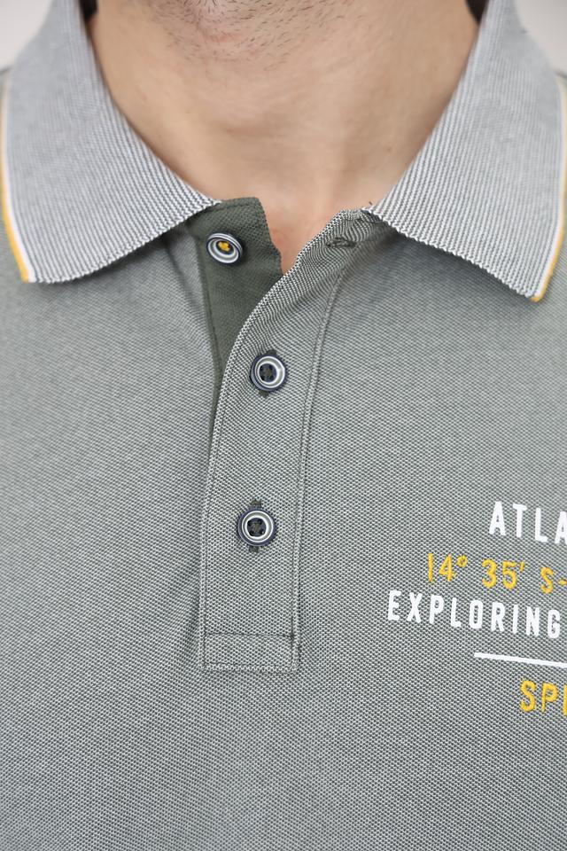 Поло украшено принтом "Atlantic" с надписью "Exploring the Ocean Spirit" в желтом цвете, что придает ему индивидуальность. Воротник и манжеты отделаны тонкой желтой полоской. Застежка выполнена на пуговицах в тон изделия.