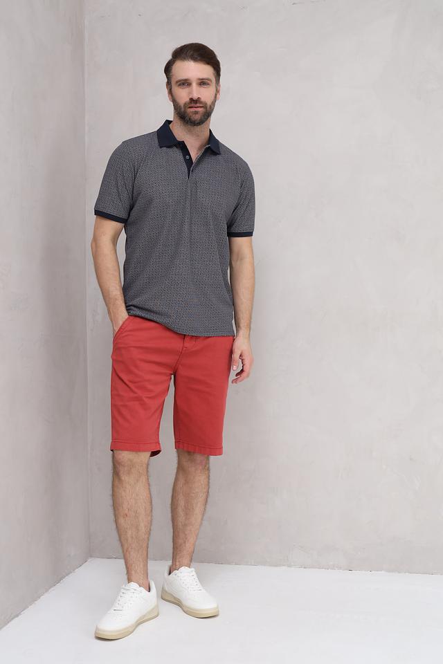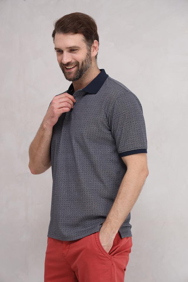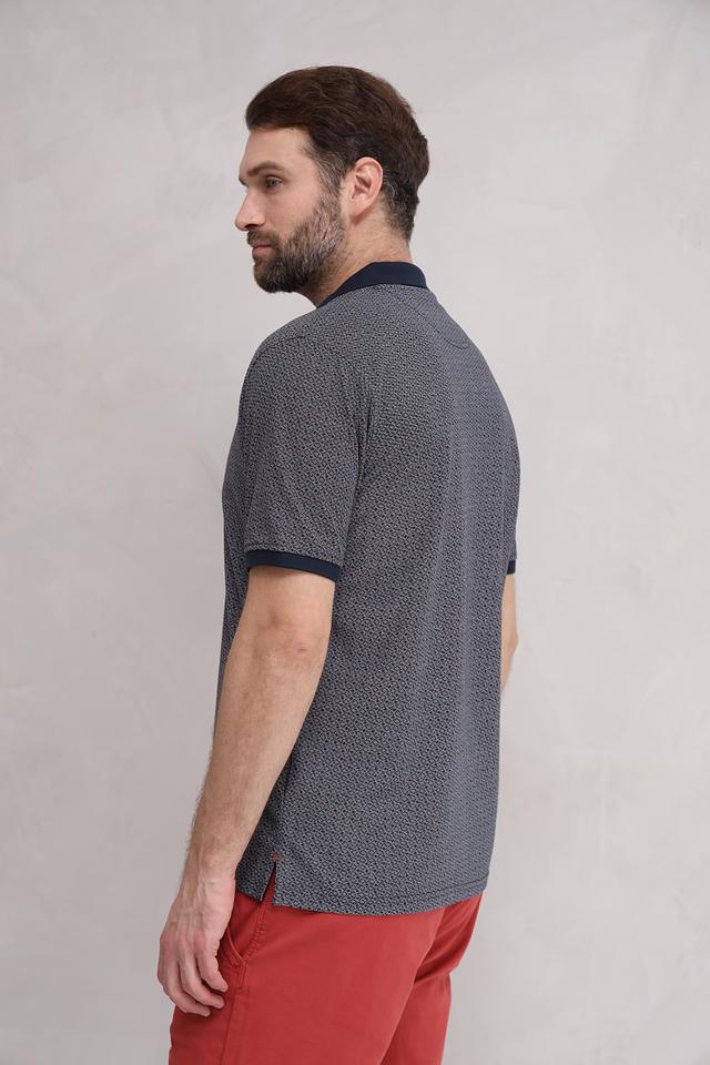 Поло имеет классический крой и короткие рукава. Основной цвет – темно-синий, украшенный мелким геометрическим рисунком. Воротник и манжеты выполнены в контрастном темно-синем цвете, что придает поло особый шарм.