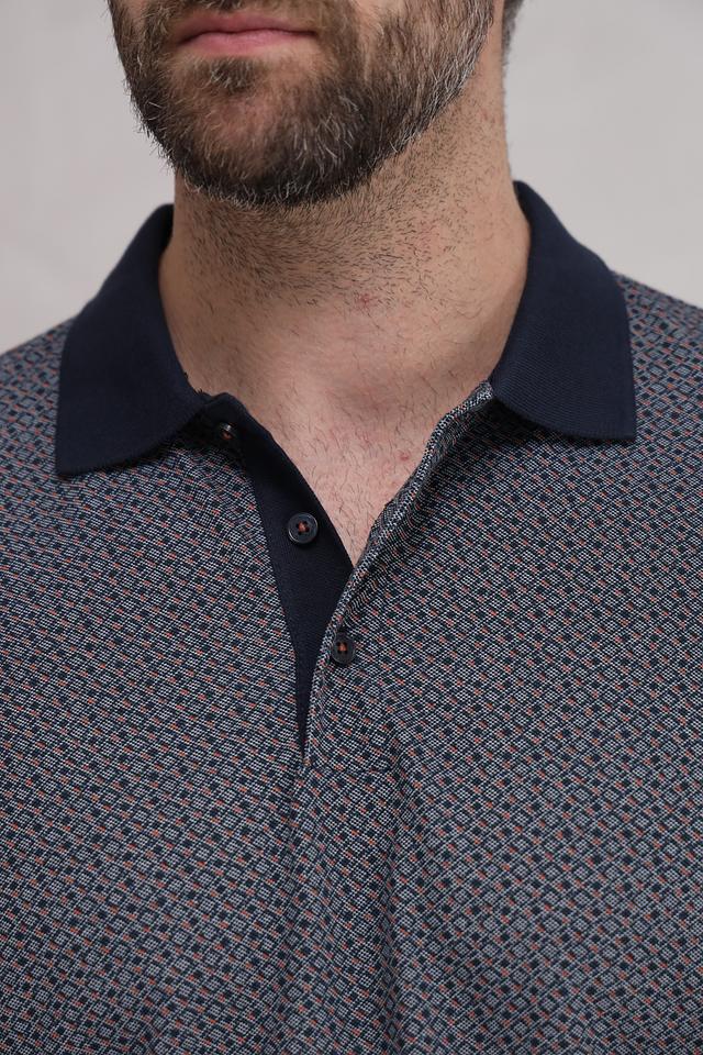 Мужское поло Casa Moda темно-синего цвета с оригинальным геометрическим рисунком и контрастным воротником и манжетами. Изготовлено из сочетания хлопка и полиэстера, обеспечивающего комфорт и практичность. Состав: полиэстер 50%, хлопок 50%