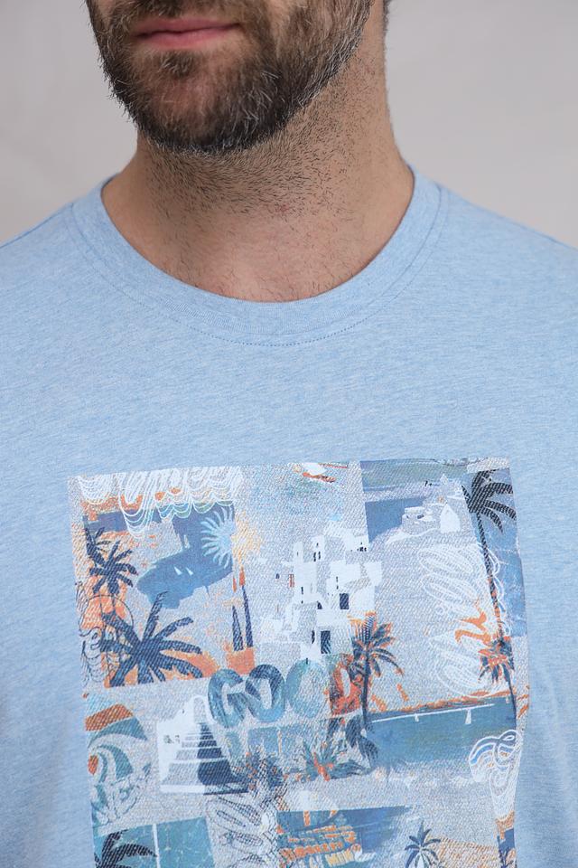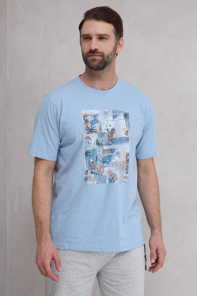 Основной цвет футболки – голубой, меланжевая текстура придает ей стильный и современный вид. Главная особенность модели – яркий принт с изображением тропического пейзажа, который добавляет образу легкости и летнего настроения.