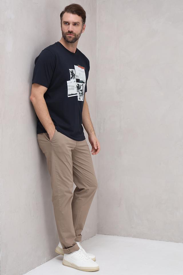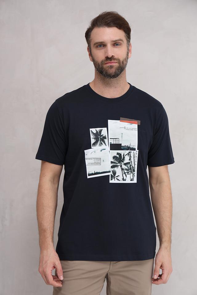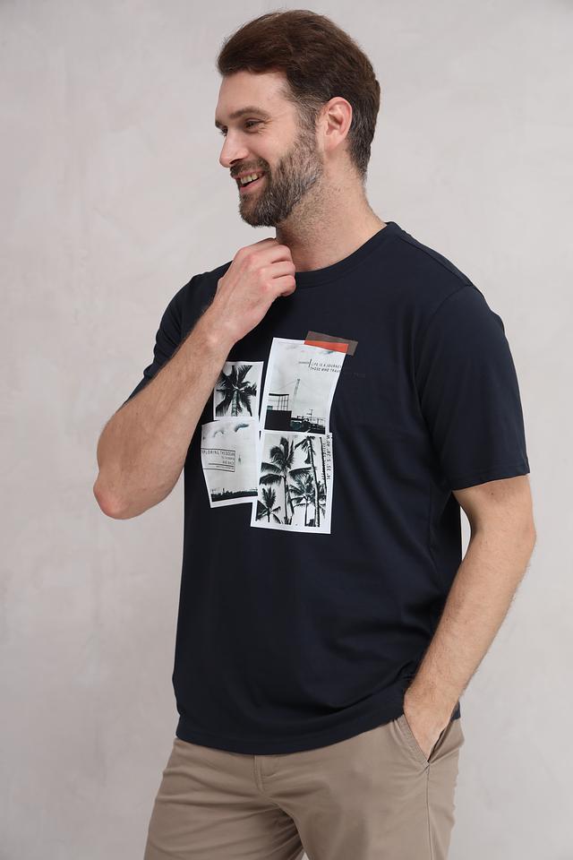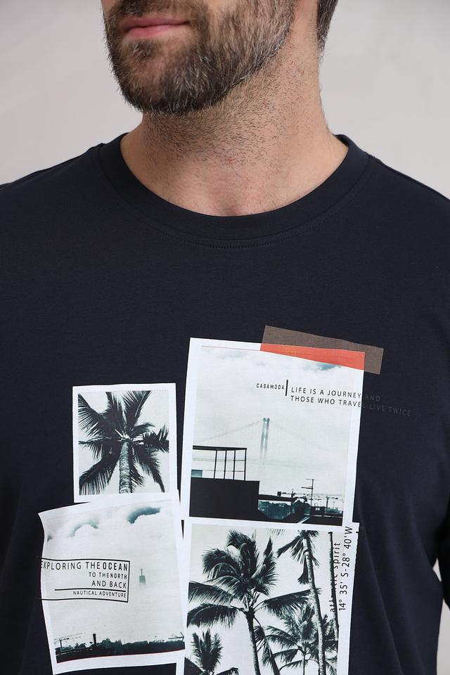 Мужская футболка Casa Moda тёмно-синего цвета с оригинальным принтом в виде коллажа из тропических мотивов. Изготовлена из 100% хлопка, обеспечивающего комфорт и воздухопроницаемость. Состав: хлопок 100%