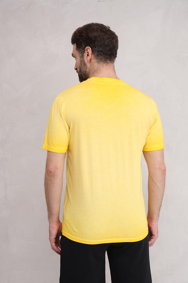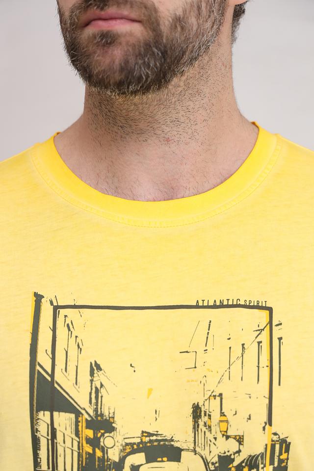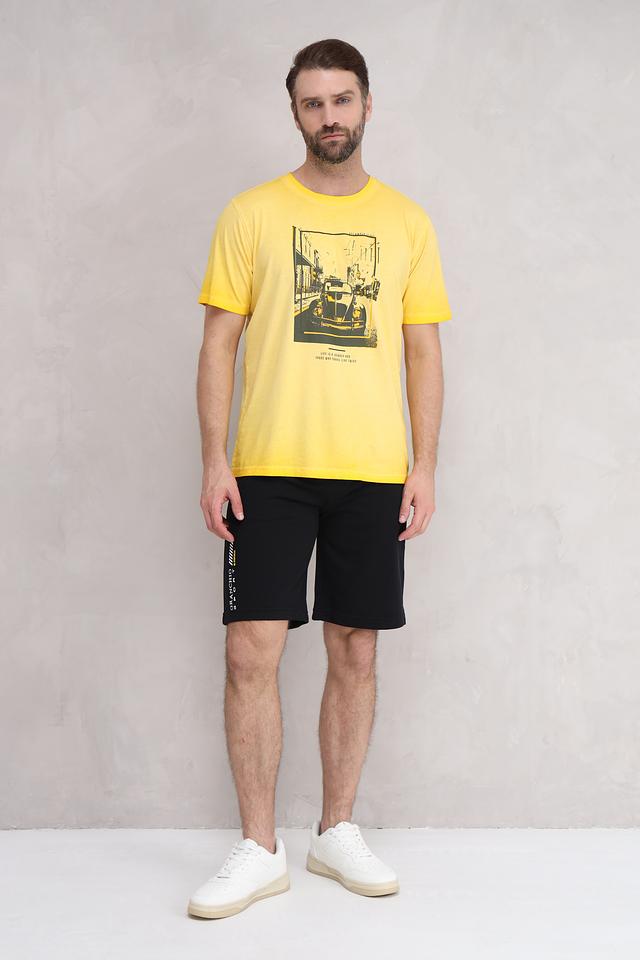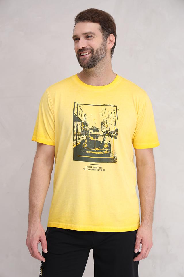 Мужская футболка Casa Moda жёлтого цвета с ярким принтом в виде автомобиля. Изготовлена из 100% хлопка, обеспечивающего комфорт и воздухопроницаемость. Стильный и удобный вариант для повседневной носки. Состав: хлопок 100%