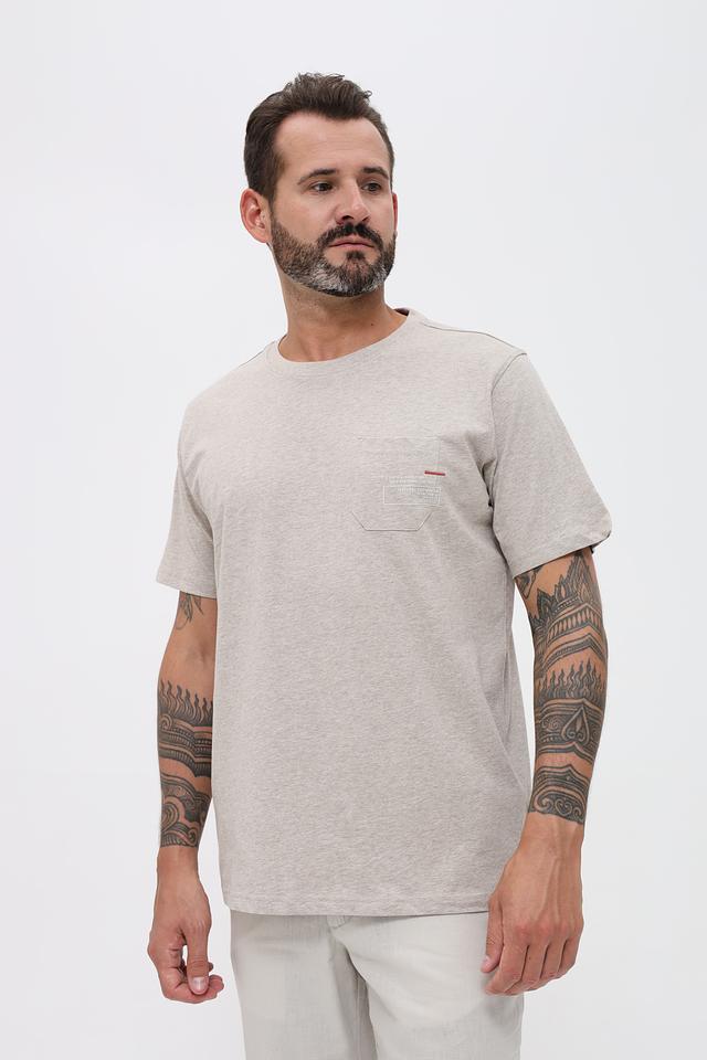 Футболка имеет классический крой с короткими рукавами и круглым вырезом горловины. На груди расположен накладной карман с небольшим логотипом бренда, добавляющий оригинальности изделию.