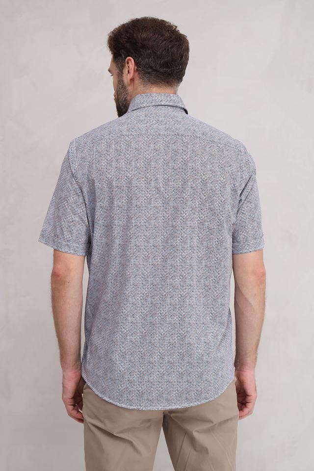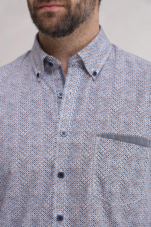 Эта рубашка от Casa Moda станет прекрасным дополнением к вашему гардеробу. Выполнена в светло-голубой цветовой гамме и украшена мелким геометрическим принтом, состоящим из оранжевых и тёмно-синих элементов.