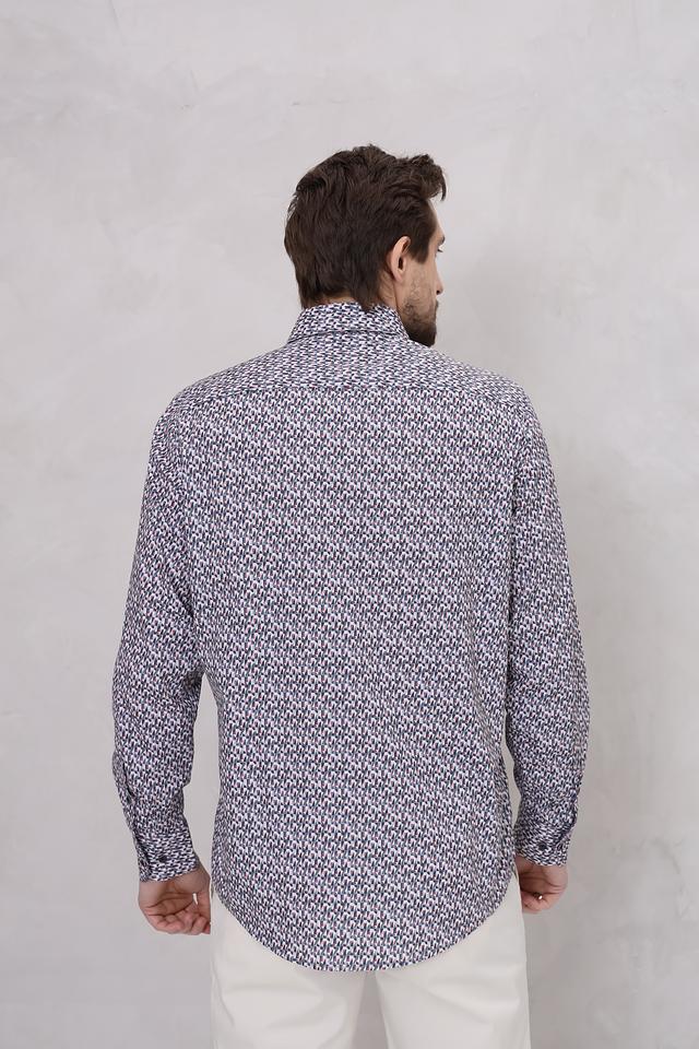 Особенностью данной модели является яркий геометрический принт, выполненный в синих, белых и серых тонах. Такой рисунок добавит вашему образу оригинальности и индивидуальности. Рубашка идеально подойдет для создания как повседневных, так и более формальных образов.